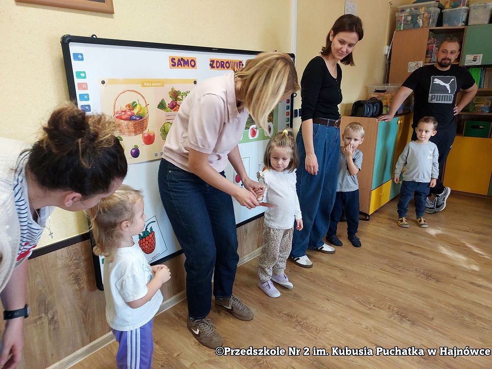 30 października w maluszkach odbyły się zajęcia otwarte z rodzicami „Kolorowy świat owoców”. Podczas zajęć dzieci rozpoznawały owoce, segregowały je według kolorów, wspólnie z mamusiami i tatusiami bawiły się i tańczyły przy muzyce. Razem ze swoimi rodzicami wykonały owocowe szaszłyki. Dzieci samodzielnie nawlekały na patyczki ulubione owoce, a następnie zajadały się własnoręcznie wykonanymi zdrowymi przekąskami. Przygotowanie szaszłyków sprawiło maluszkom dużo radości. Serdecznie dziękujemy rodziców za zaangażowanie, pomoc i włączenie się w zabawę.