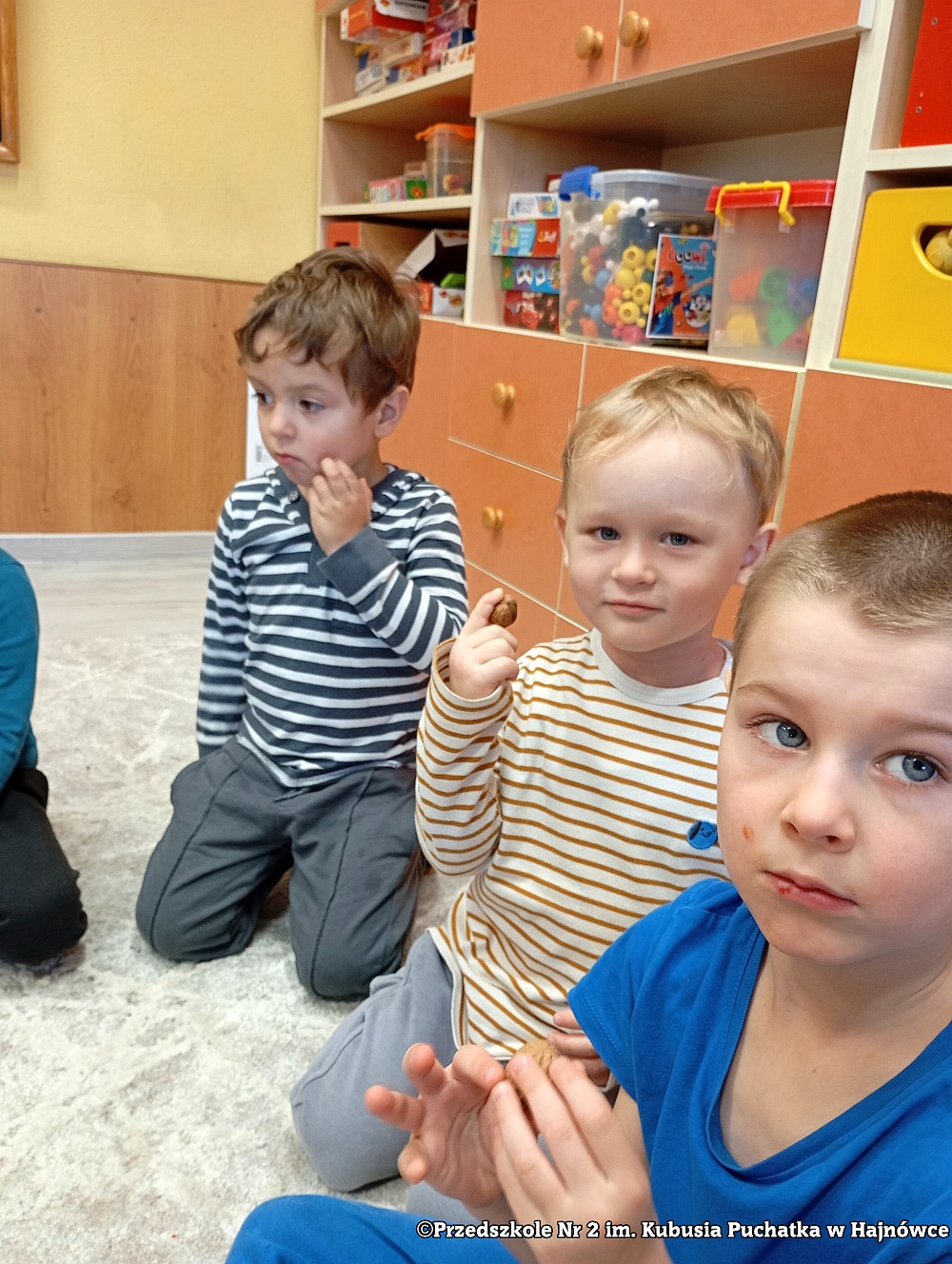 Grupa Puchatków uroczyście powitała nową porę roku – Panią Jesień, która będzie panować nam przez najbliższe miesiące. Podczas spotkania z Panią Mają, pracownikiem Nadleśnictwa Hajnówka wybraliśmy się na spacer do lasu w celu szukania pierwszych oznak jesieni. Pani Leśnik opowiedziała nam o zmianach zachodzących w przyrodzie, o jesiennych pracach zwierząt, wymienialiśmy a potem szukaliśmy darów jesiennego lasu tj. kasztany, żołędzie, jarzębina. Dziękujemy bardzo za wspólnie spędzony czas.