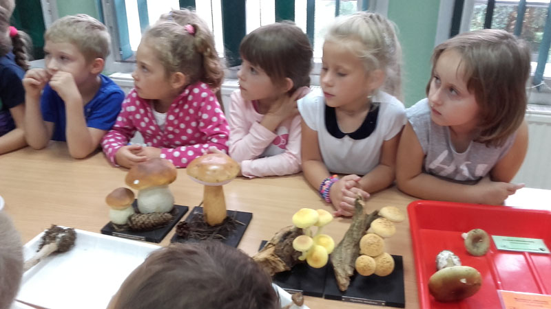 grzybom, jak i ich modelom, łudząco przypominającym oryginały. Dzieci z uwagą