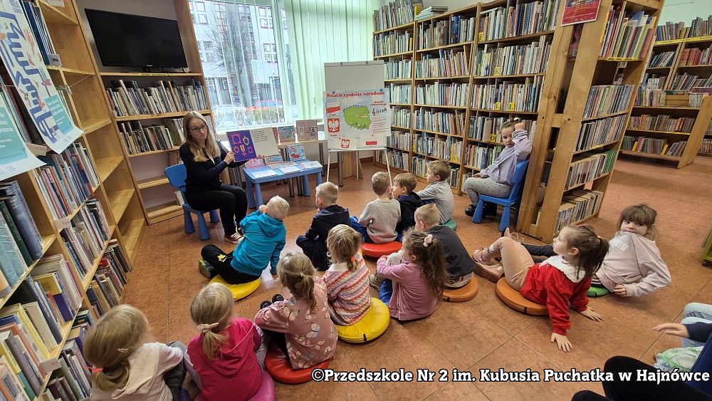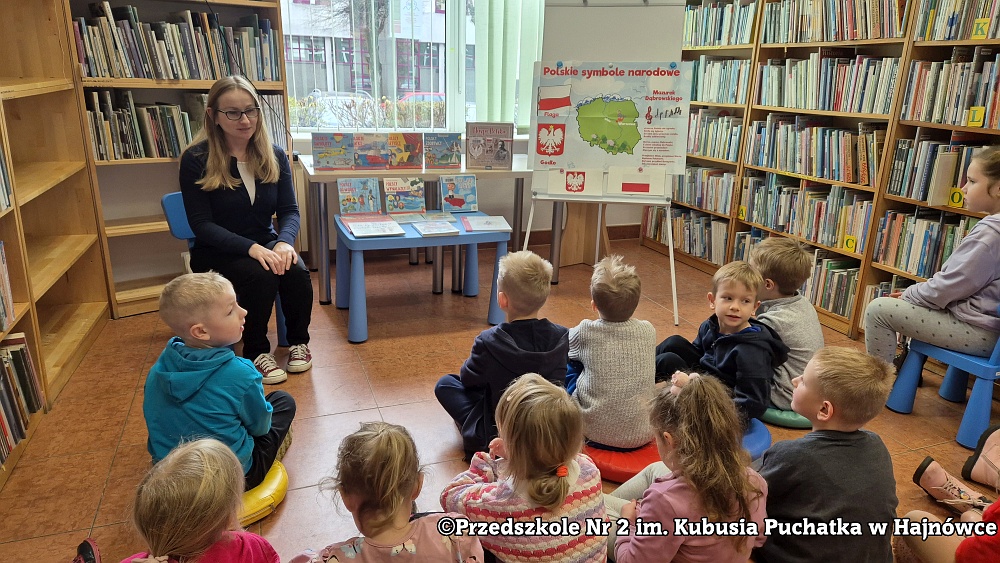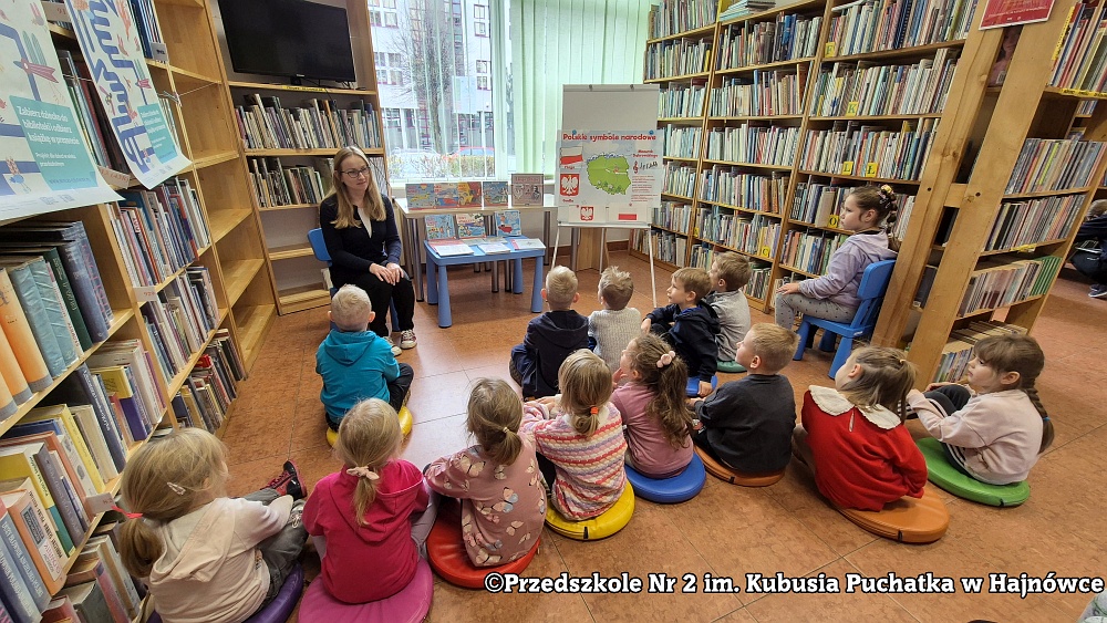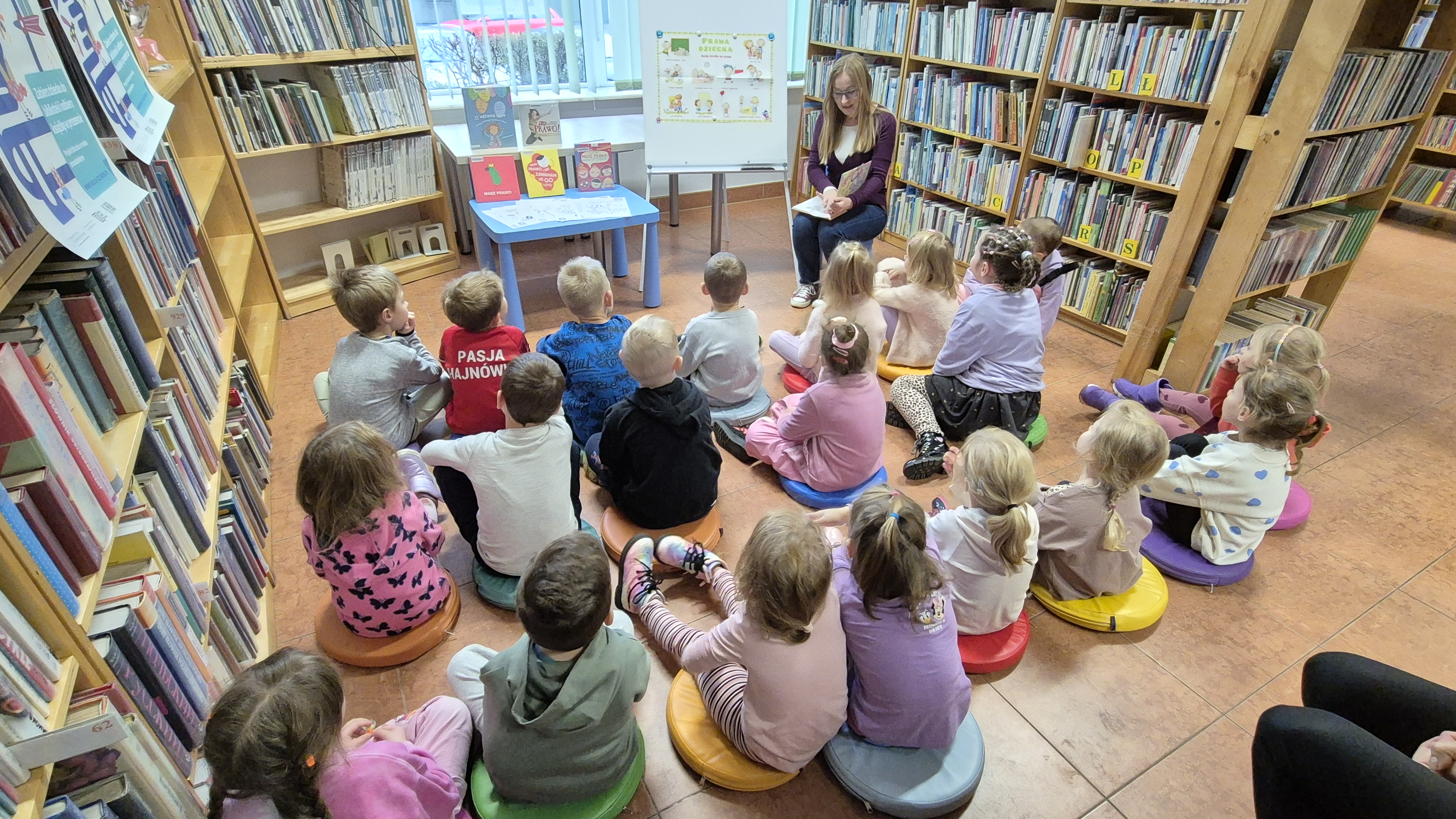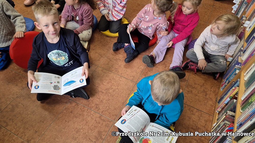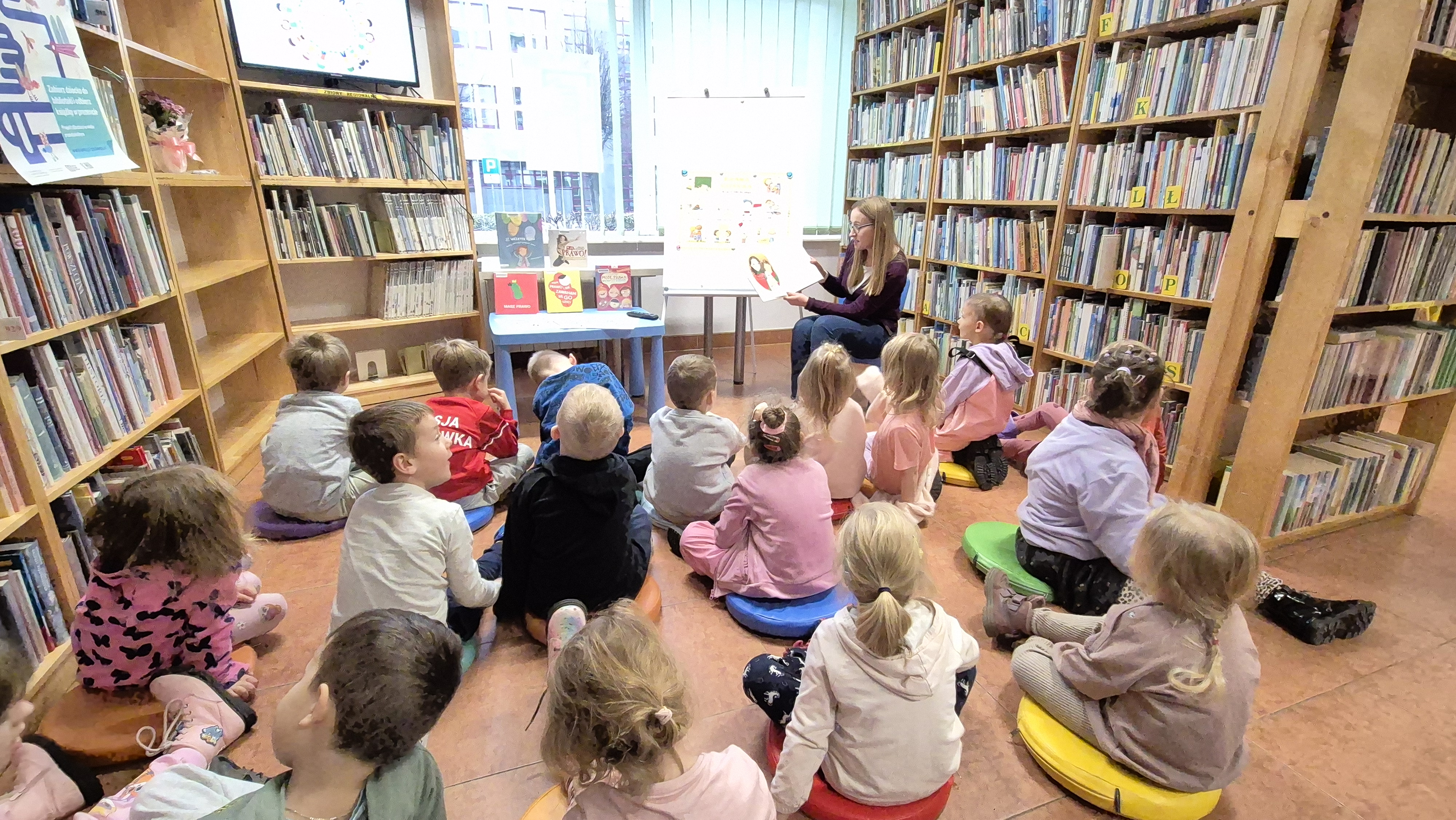 W czwartek, 26 września, dzieci z grupy „Króliczki” (5–6 lat) wzięły udział w wyjątkowej wycieczce do Miejskiej Biblioteki Publicznej. Celem wizyty były zajęcia edukacyjne zatytułowane „Nadeszła jesień”, które poprowadziła Pani Asia – bibliotekarka z pasją, która doskonale potrafi rozbudzać dziecięcą ciekawość świata. Dzieci poznały charakterystyczne cechy jesieni, dowiedziały się, jakie owoce i warzywa dojrzewają o tej porze roku, oraz jak zwierzęta przygotowują się do zimy. Wycieczka do biblioteki była dla „Króliczków” nie tylko ciekawym doświadczeniem edukacyjnym, ale także okazją do poznania miejsca, w którym książki stają się bramą do świata wyobraźni. Dzieci wróciły do przedszkola pełne wrażeń, z nową wiedzą i uśmiechami na twarzach .
