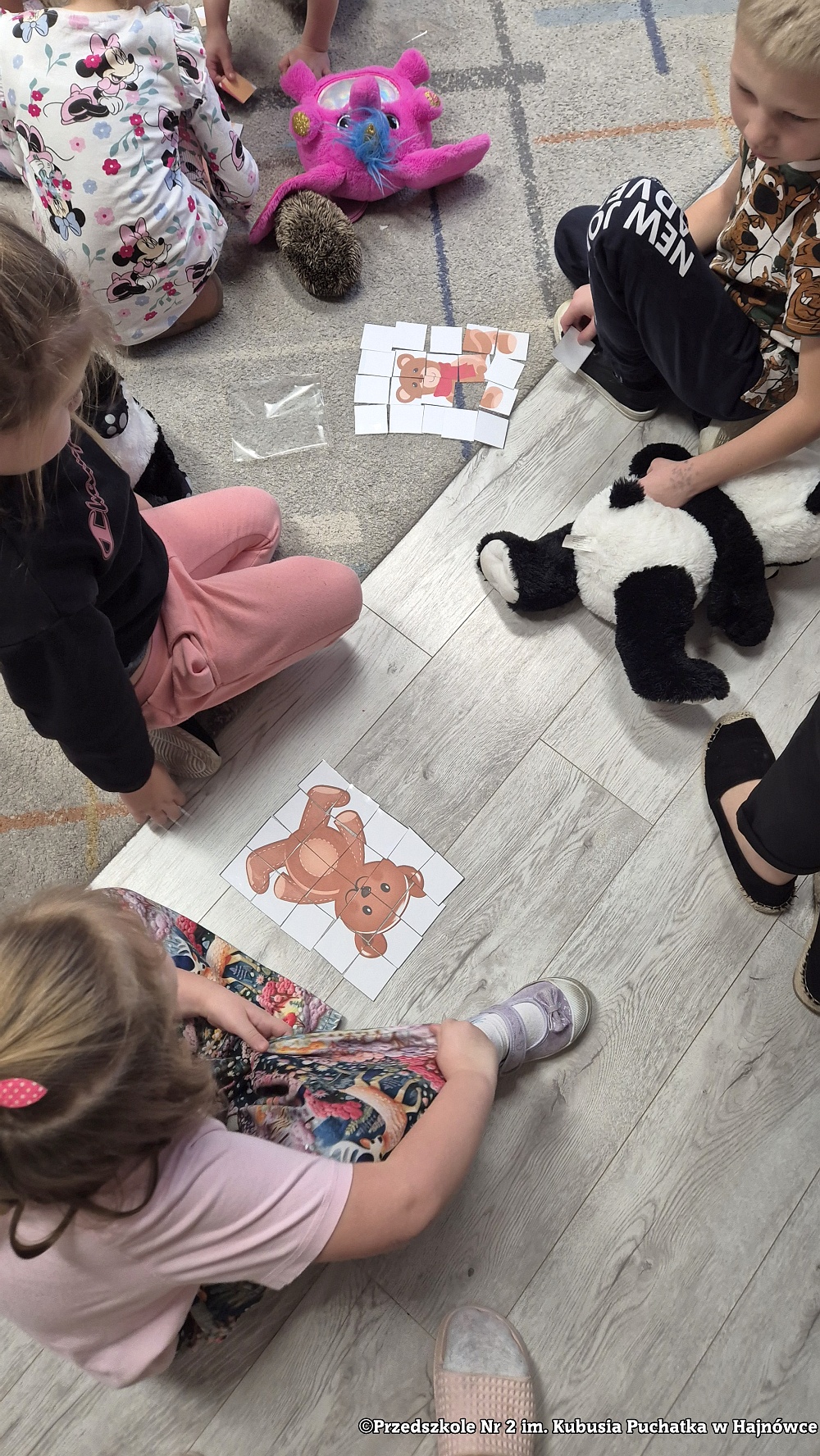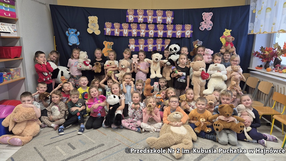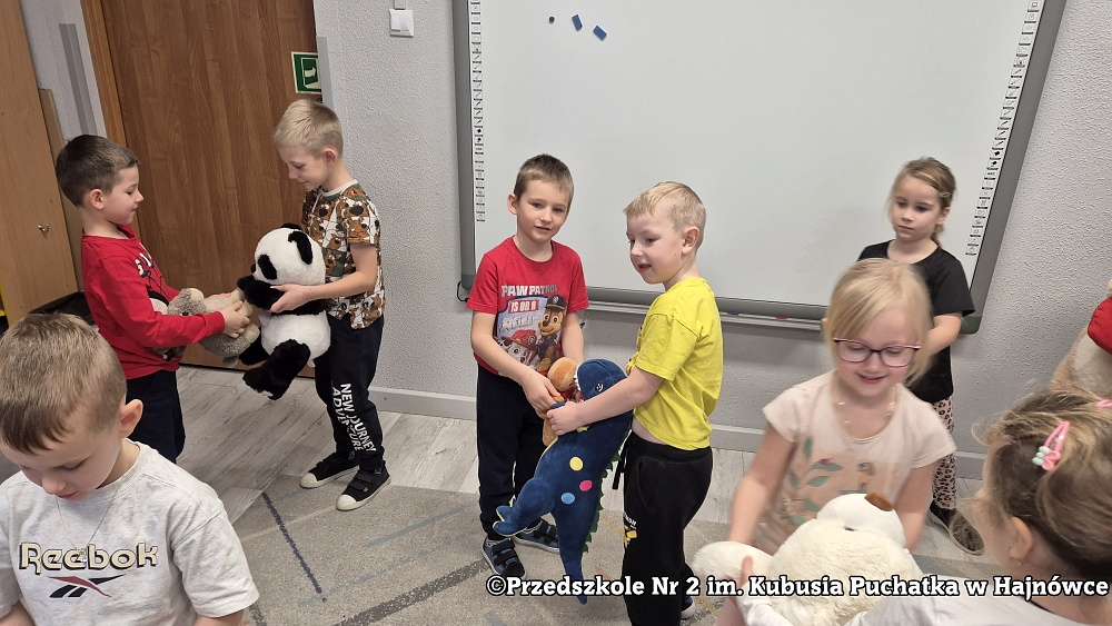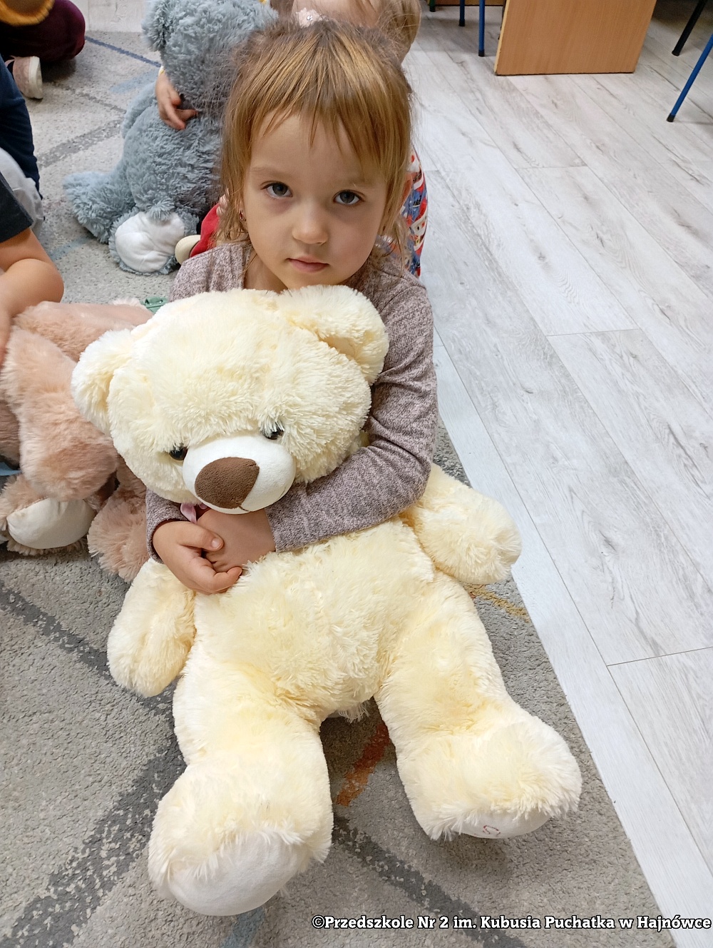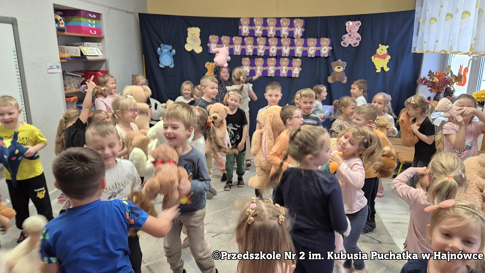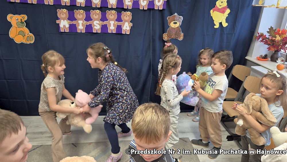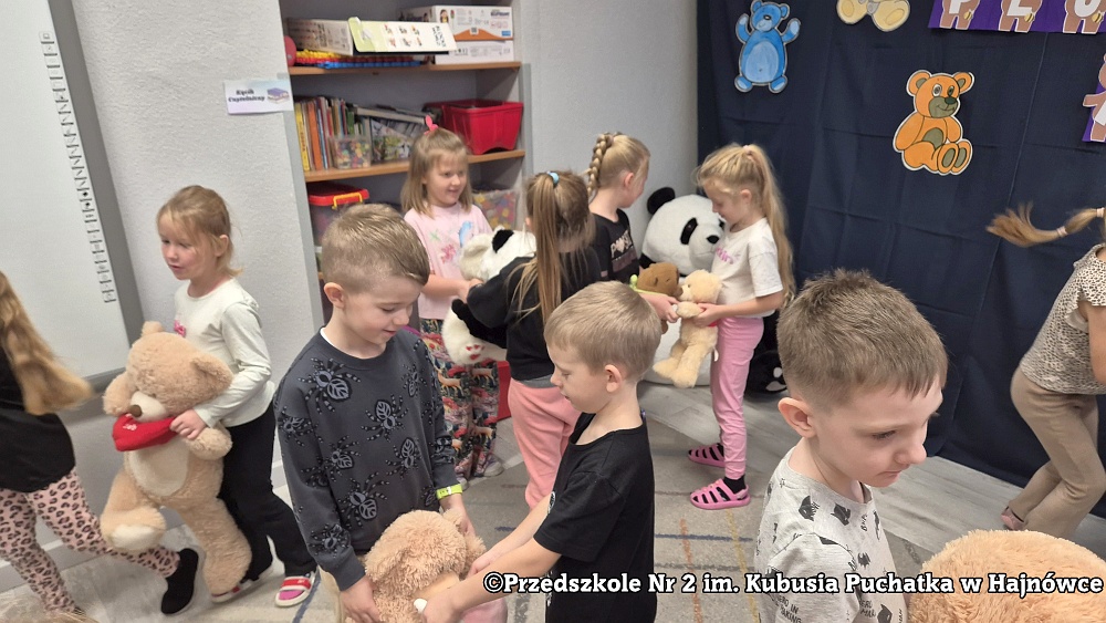 W naszej grupie ten dzień miał wyjątkowy, pełen ciepła i radości charakter. Dzieci z samego rana przyszły do sali z własnymi pluszowymi przyjaciółmi, które tego dnia były honorowymi gośćmi. Na początku zajęć każde dziecko mogło zaprezentować swojego pluszaka, opowiadając o jego imieniu, historii oraz o tym, dlaczego jest dla niego wyjątkowy. To wspaniałe ćwiczenie rozwijające umiejętności językowe, odwagę i zdolność wypowiadania się na forum grupy. Następnie wspólnie z pedagogiem specjalnym odbyły misiowe zabawy i aktywności wspólne śpiewanie piosenek o misiach, zabawy ruchowe, takie jak „Misiowa gimnastyka”. Największym zainteresowaniem cieszyły prace plastyczne, w trakcie których dzieci mogły w sposób sensoryczny z wykorzystaniem nitek stworzyć własne „misiowe portrety”. Nie zabrakło także chwili wyciszenia – nauczycielki czytały fragmenty bajek o misiach. Dzieci z uwagą słuchały przygód Kubusia Puchatka, Misia Uszatka i innych bohaterów, rozwijając przy tym wyobraźnię i zainteresowanie literaturą dziecięcą.