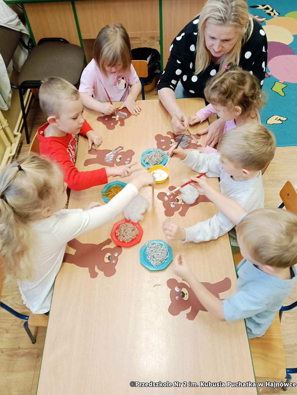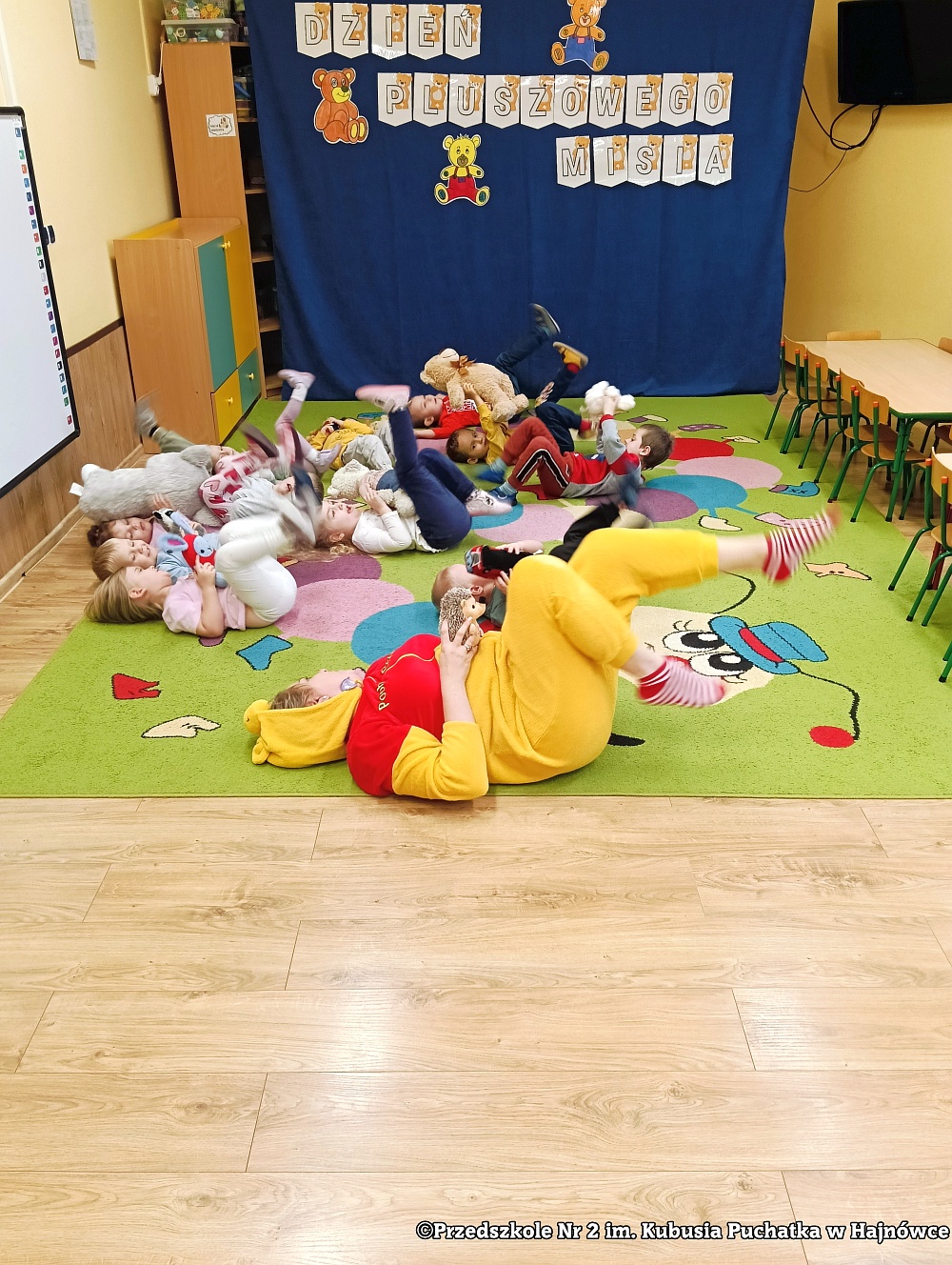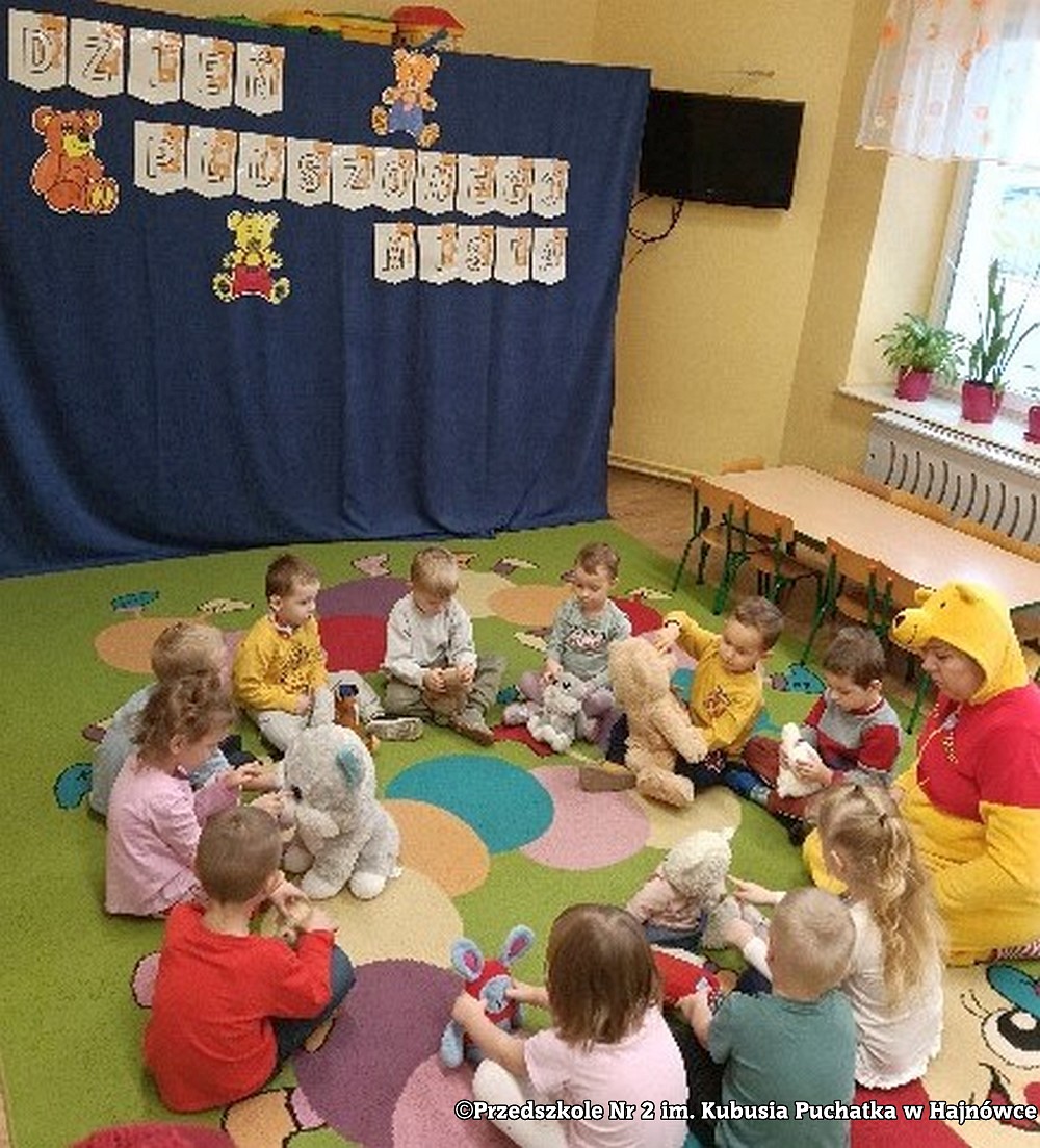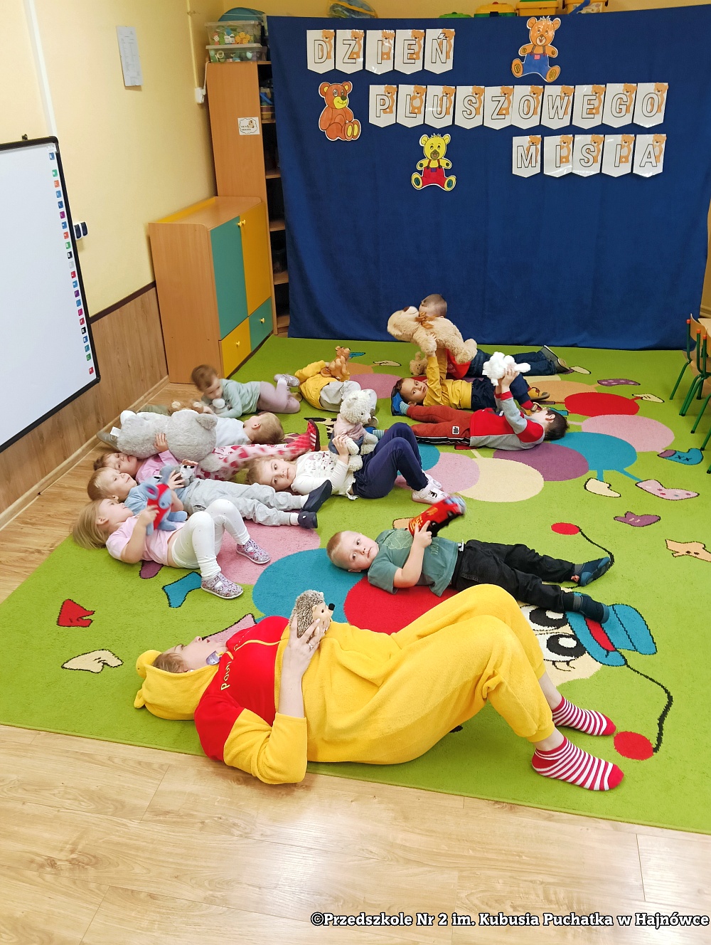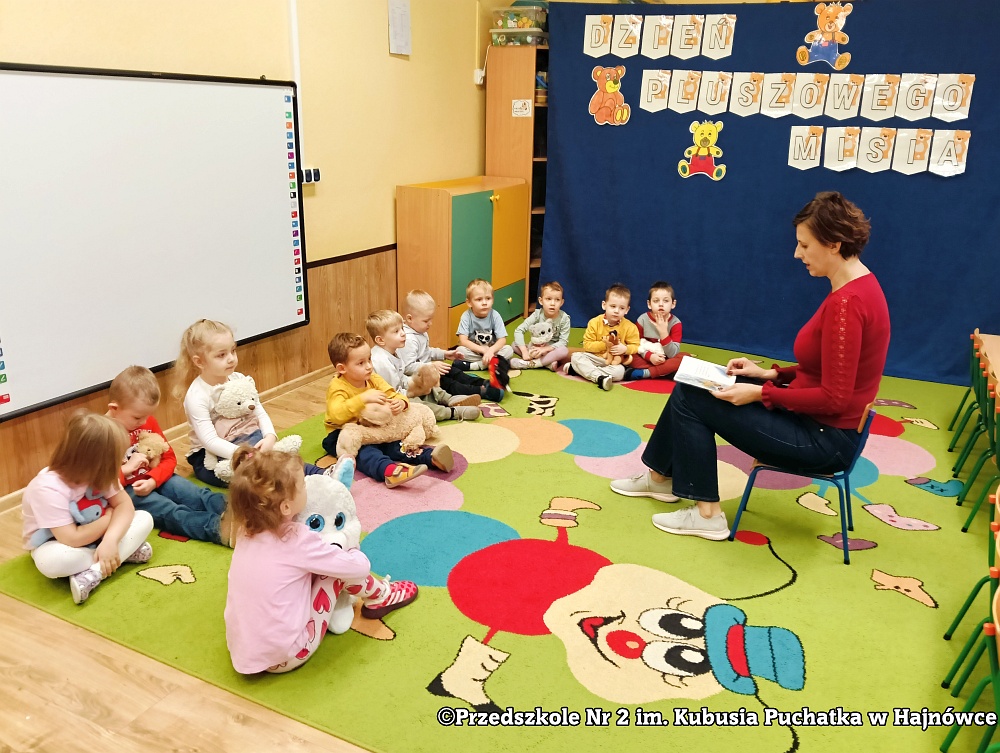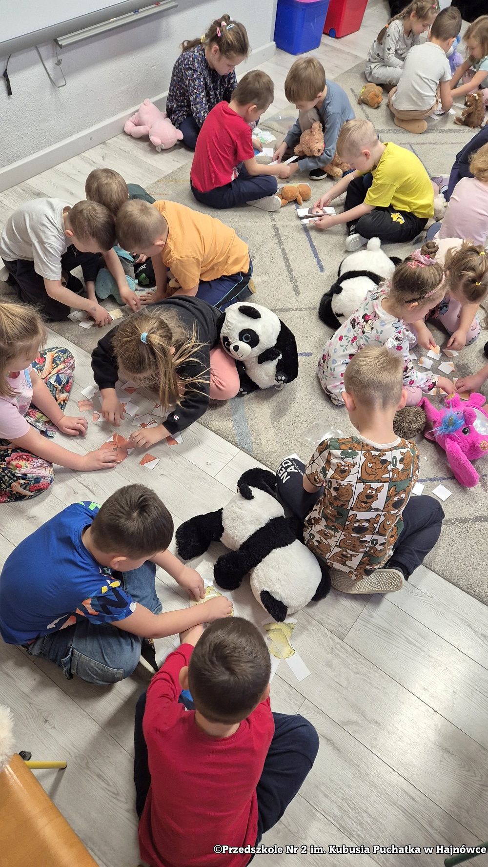 W naszej grupie ten dzień miał wyjątkowy, pełen ciepła i radości charakter. Dzieci z samego rana przyszły do sali z własnymi pluszowymi przyjaciółmi, które tego dnia były honorowymi gośćmi. Na początku zajęć każde dziecko mogło zaprezentować swojego pluszaka, opowiadając o jego imieniu, historii oraz o tym, dlaczego jest dla niego wyjątkowy. To wspaniałe ćwiczenie rozwijające umiejętności językowe, odwagę i zdolność wypowiadania się na forum grupy. Następnie wspólnie z pedagogiem specjalnym odbyły misiowe zabawy i aktywności wspólne śpiewanie piosenek o misiach, zabawy ruchowe, takie jak „Misiowa gimnastyka”. Największym zainteresowaniem cieszyły prace plastyczne, w trakcie których dzieci mogły w sposób sensoryczny z wykorzystaniem nitek stworzyć własne „misiowe portrety”. Nie zabrakło także chwili wyciszenia – nauczycielki czytały fragmenty bajek o misiach. Dzieci z uwagą słuchały przygód Kubusia Puchatka, Misia Uszatka i innych bohaterów, rozwijając przy tym wyobraźnię i zainteresowanie literaturą dziecięcą.