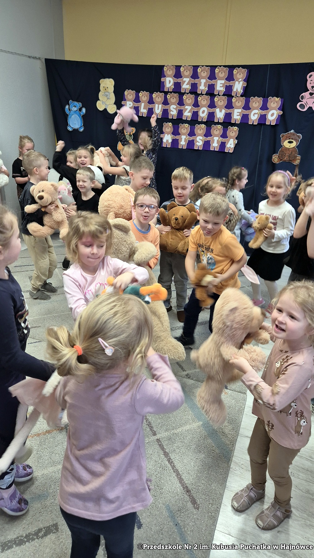 Duże, małe, kolorowe, puchate i mięciutkie pluszowe misie przybyły ze swymi małymi właścicielami, żeby bawić się i świętować w ramach obchodów Światowego Dnia Pluszowego Misia. Spotkanie rozpoczęło się od przedstawienia swojego pluszowego przyjaciela i poznania historii jego powstania. Dzieci odgadywały misie pochodzące z różnych bajek, m. in. Uszatek, Yogi, czy Kubuś Puchatek. Następnie zaprosiły swoje pluszaki do wspólnej zabawy. Dzieci bawiły się doskonale, tańczyły z misiami w rytm piosenek- w parach i taniec zamrażaniec. Kolejną atrakcją było układanie puzzli z misiami na wyścigi. Na koniec dzieci wykonały piękną misiową prace plastyczną. Ten dzień w przedszkolu pełen był uśmiechu oraz wspólnej zabawy, jednak najwięcej radości sprawił dzieciom sam fakt zaprezentowania swojego przyjaciela- misia kolegom i możliwość zabawy z pluszakiem.