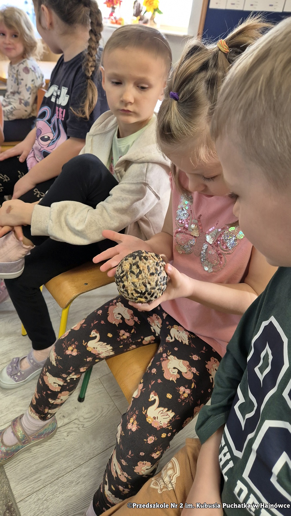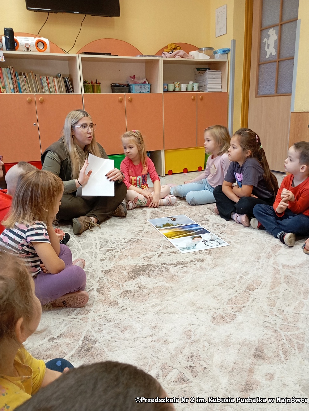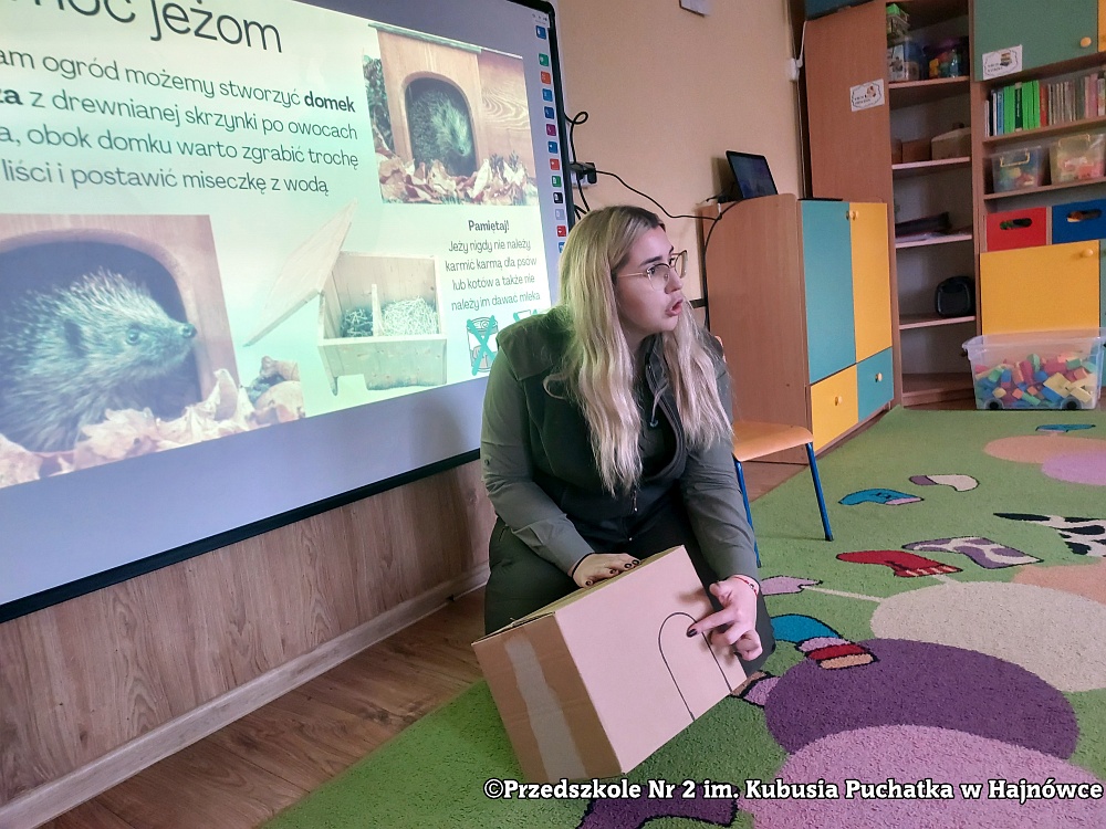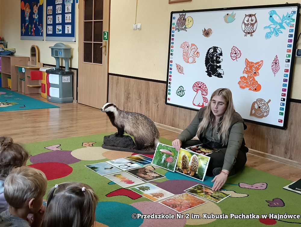 Na zdjęciach widocznie są dzieci z grupy I “Sówki” w trakcie udziału w spotkaniu z leśnikiem na temat obchodów Dnia Jeża.