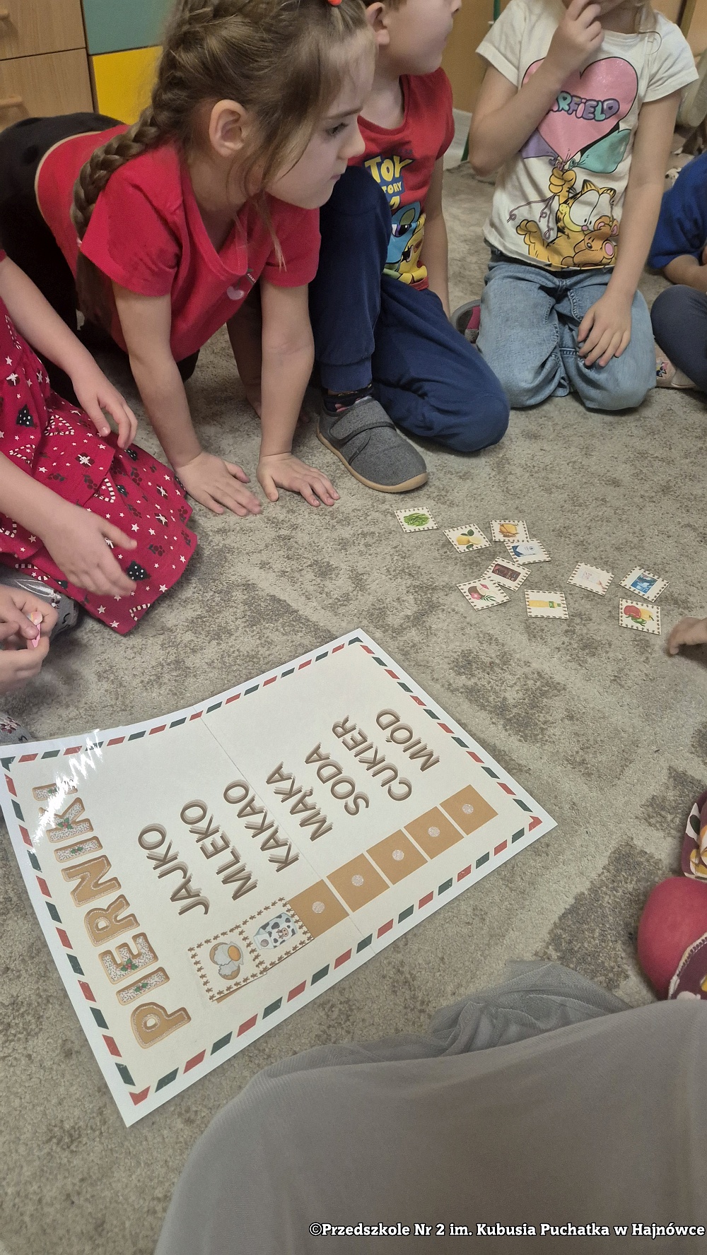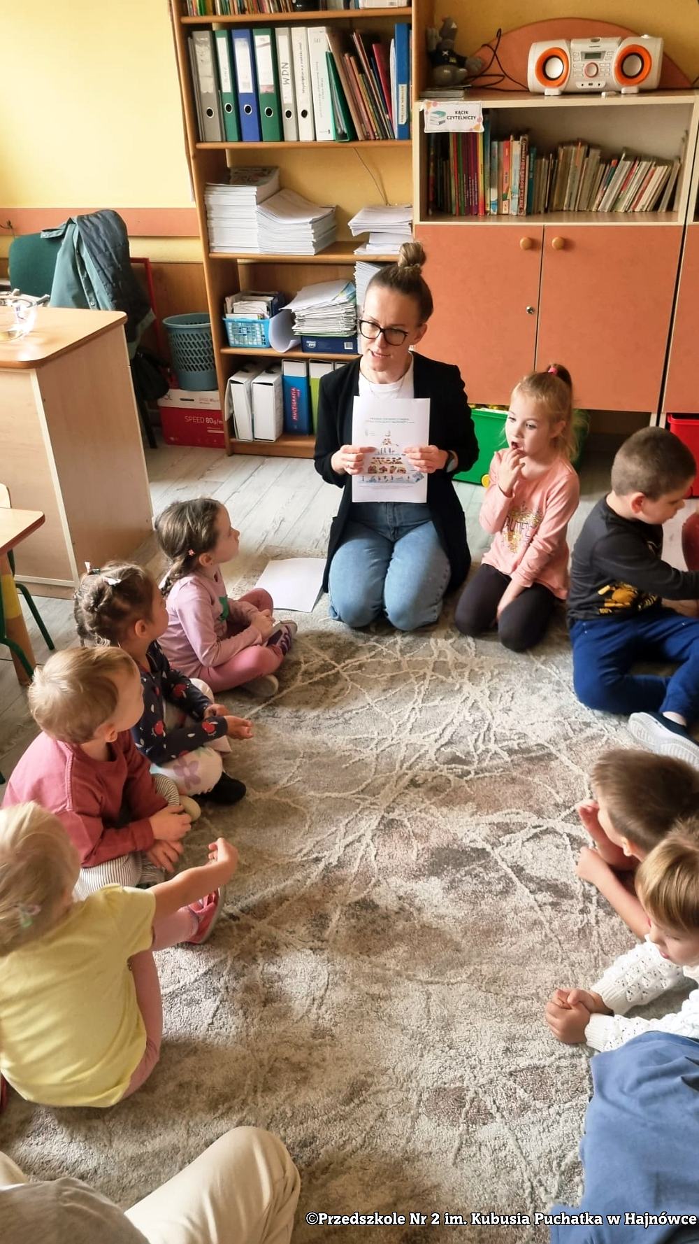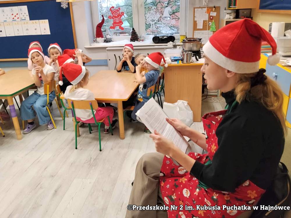 Następnie odbyło się wspólne czytanie książki „Jadzia Pętelka piecze pierniki” w ramach programu „Mali Czytelnicy” realizowanego przy wsparciu Fundacji „Cała Polska Czyta Dzieciom”. Dzieci z zainteresowaniem słuchały historii o przygotowaniach do świąt którą przeczytała mama Marty.