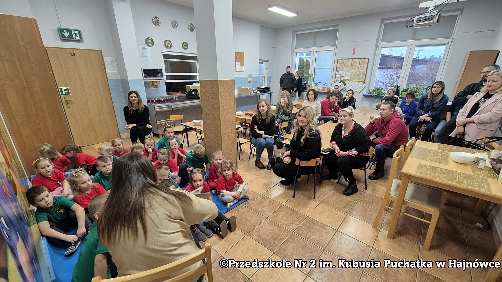 Na zakończenie naszego święta Pani Dyrektor przeczytała na głos książkę "Kicia Kocia w Bibliotece", którą mogliśmy jednocześnie oglądać na dużym ekranie. Dzięki temu każde dziecko mogło śledzić kolorowe ilustracje, a historia o przygodach bohatera książki nabrała jeszcze więcej uroku. Dzieci słuchały z zapartym tchem, a po zakończeniu opowieści z chęcią dzieliły się swoimi wrażeniami. Na koniec każde z dzieci otrzymało kolorowankę ze specjalnym zaproszeniem dla rodziców, aby wspólnie przeczytać swojej grupie ulubioną książkę.