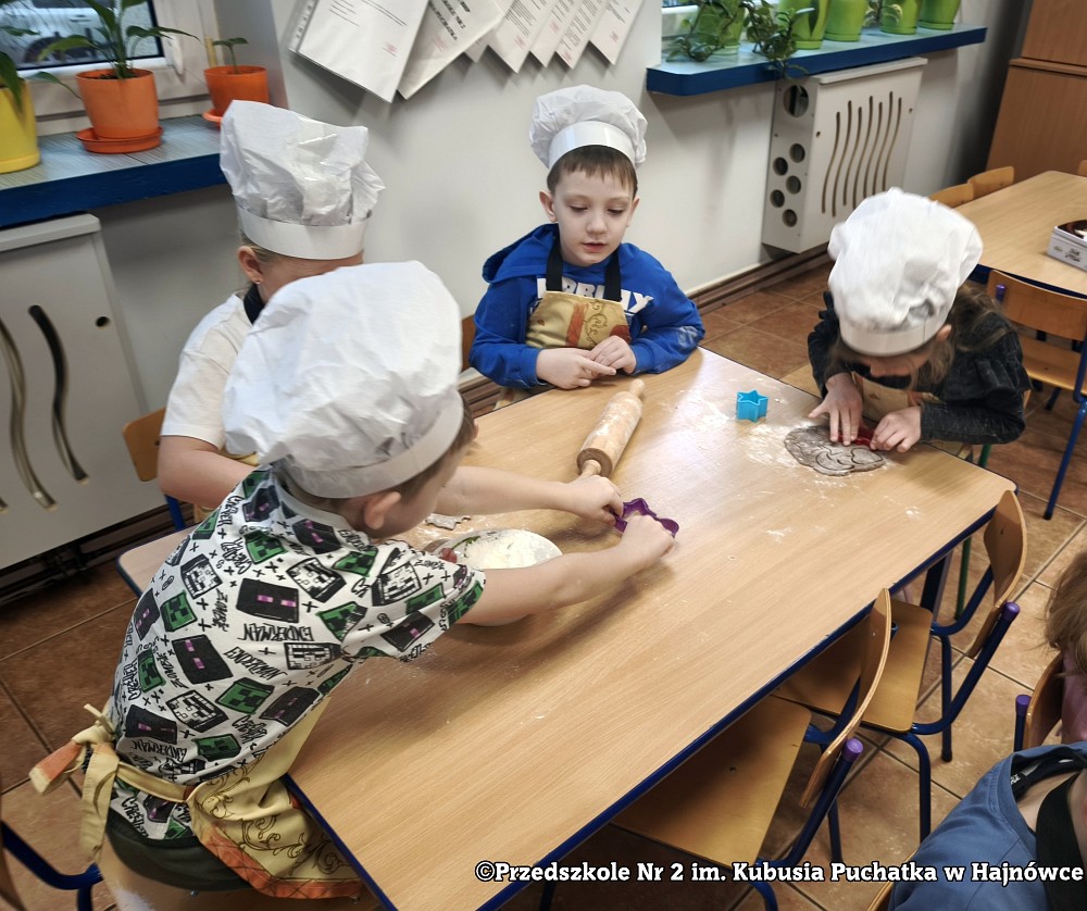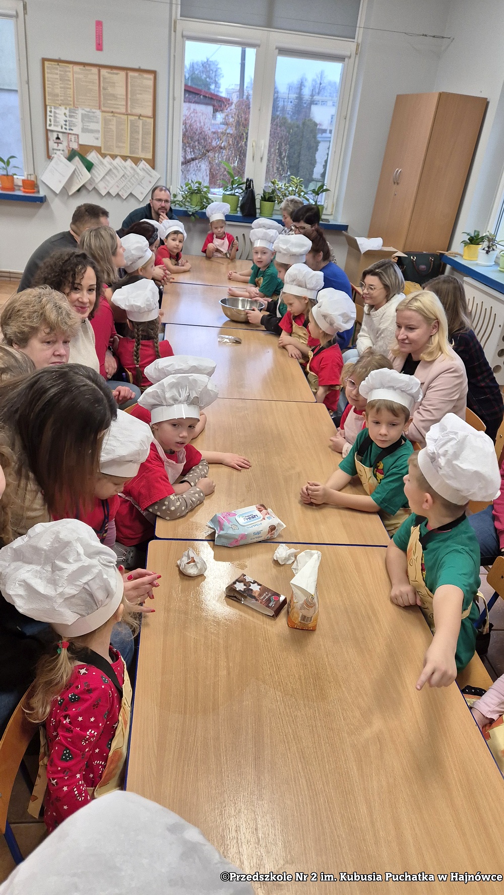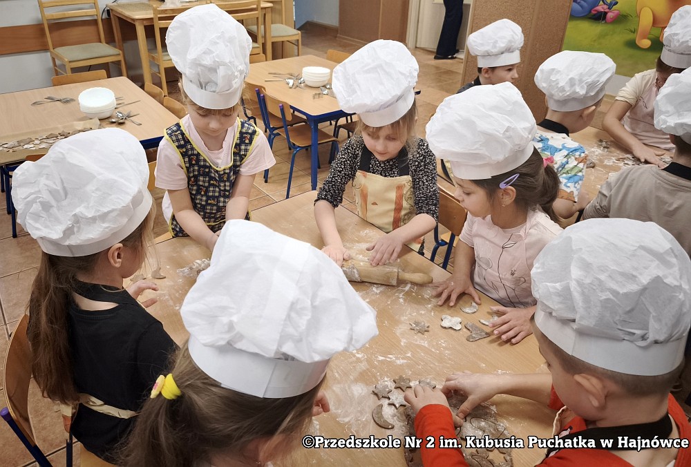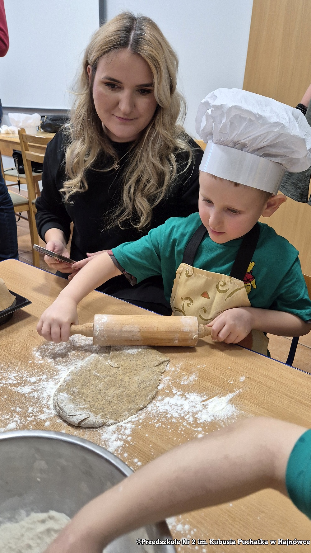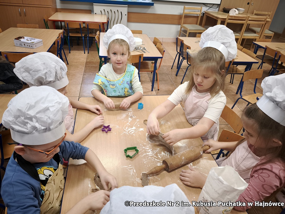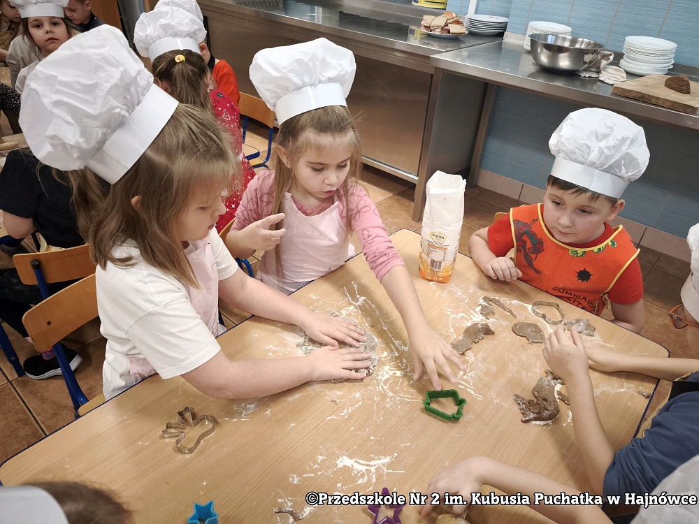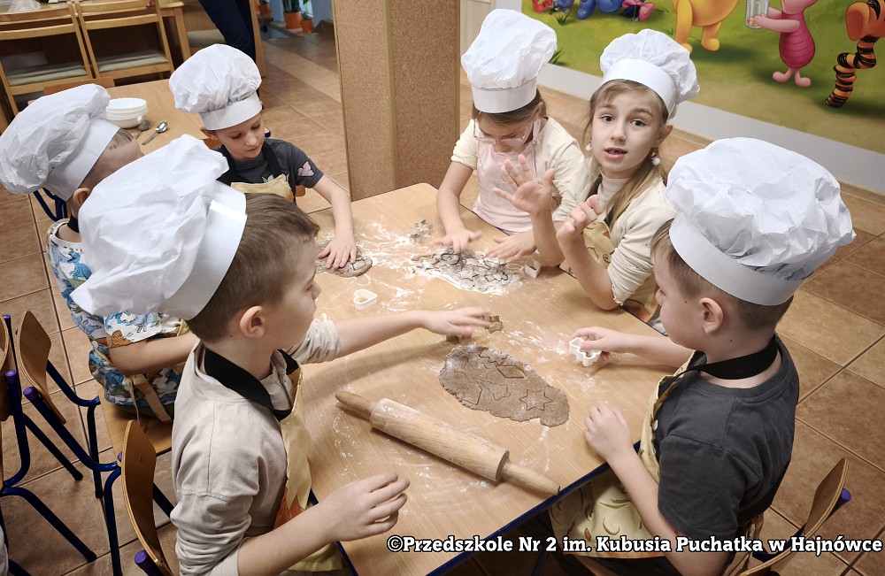 Kulminacją spotkania było wspólne pieczenie ciasteczek. Zarówno dzieci, jak i dorośli z zapałem mieszali i wałkowali ciasto, wycinali kształty i dekorowali pierniczki. Wspólna praca sprawiła wszystkim ogromną radość, a zapach świeżo pieczonych ciasteczek unosił się w całej stołówce.