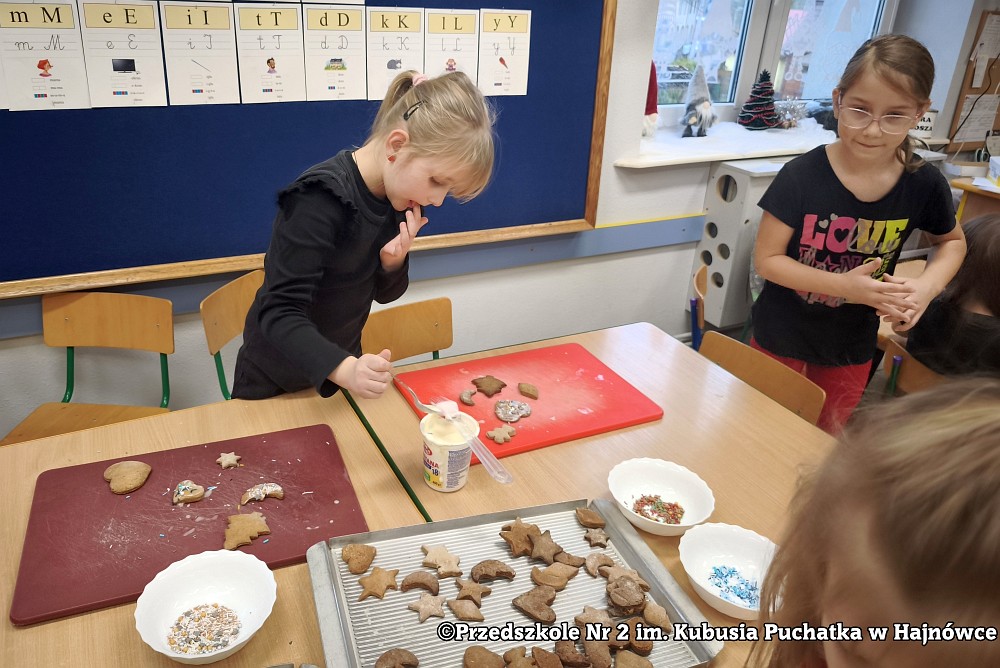 Na zdjęciach widoczne są dzieci z grupy podczas robienia i dekorowana świątecznych pierniczków.