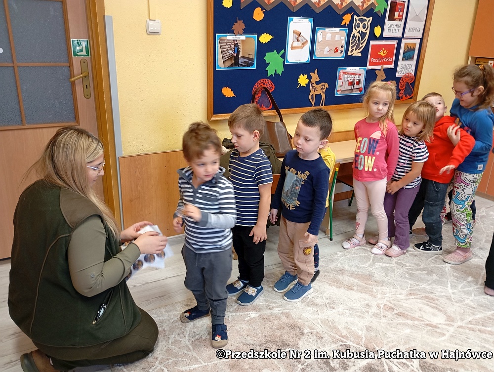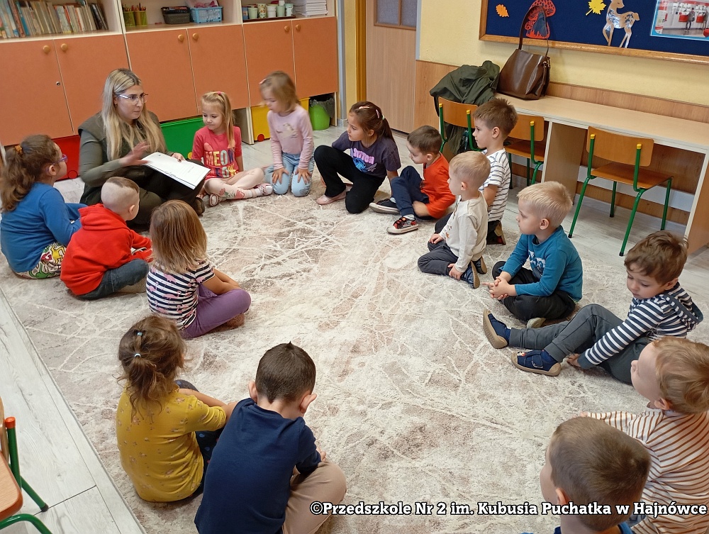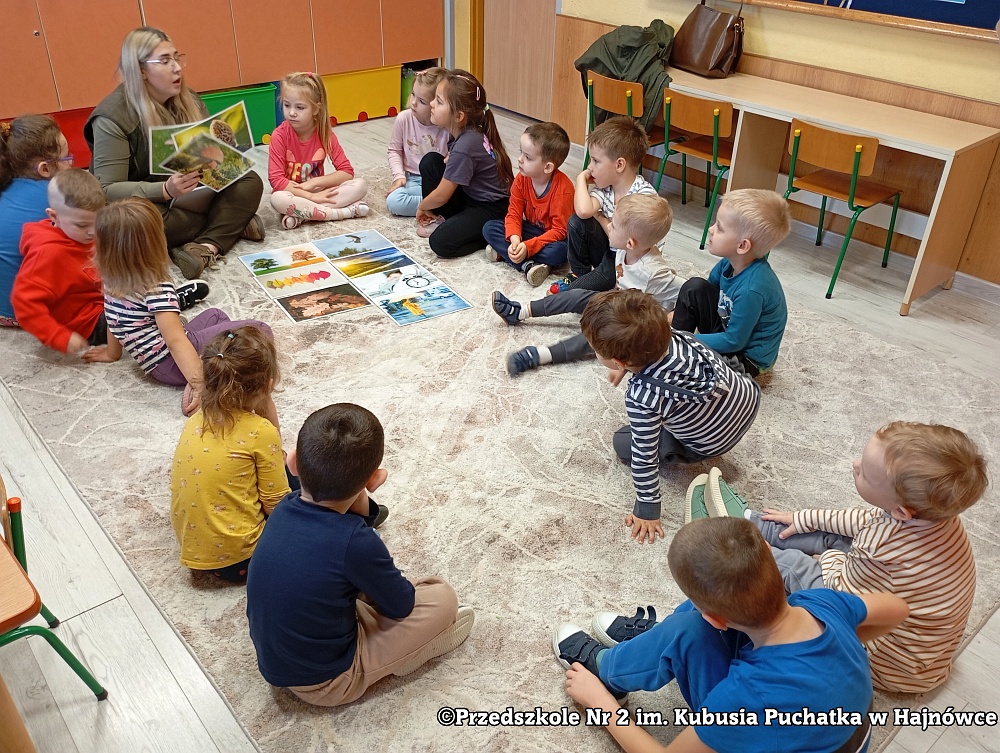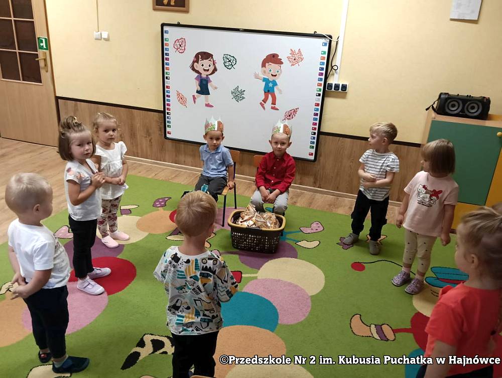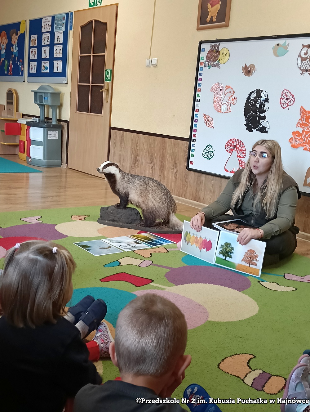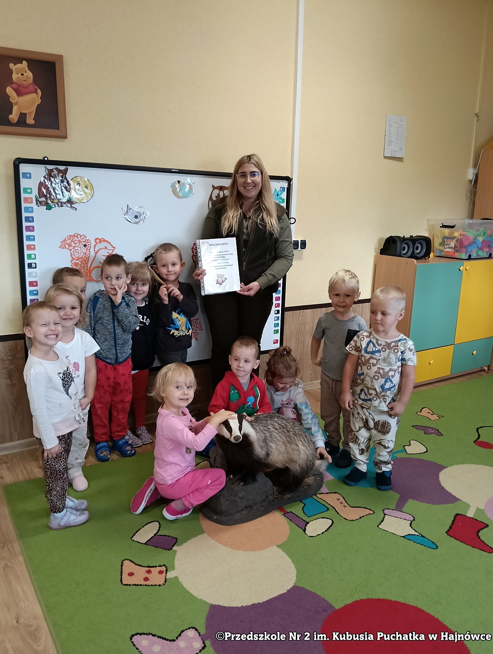 Grupa Puchatków uroczyście powitała nową porę roku – Panią Jesień, która będzie panować nam przez najbliższe miesiące. Podczas spotkania z Panią Mają, pracownikiem Nadleśnictwa Hajnówka wybraliśmy się na spacer do lasu w celu szukania pierwszych oznak jesieni. Pani Leśnik opowiedziała nam o zmianach zachodzących w przyrodzie, o jesiennych pracach zwierząt, wymienialiśmy a potem szukaliśmy darów jesiennego lasu tj. kasztany, żołędzie, jarzębina. Dziękujemy bardzo za wspólnie spędzony czas.