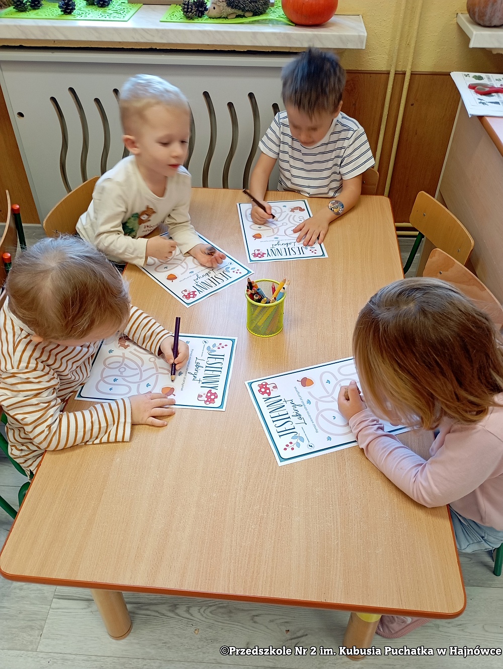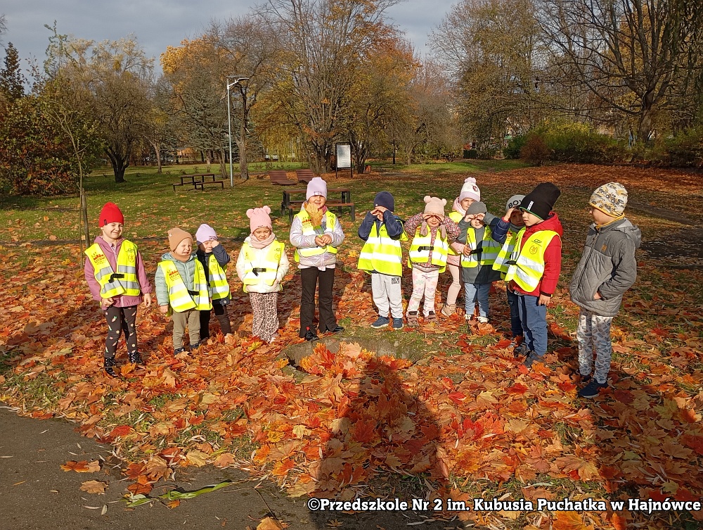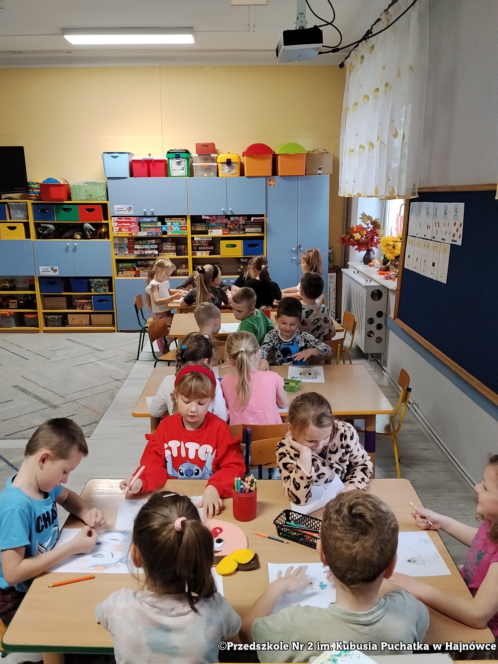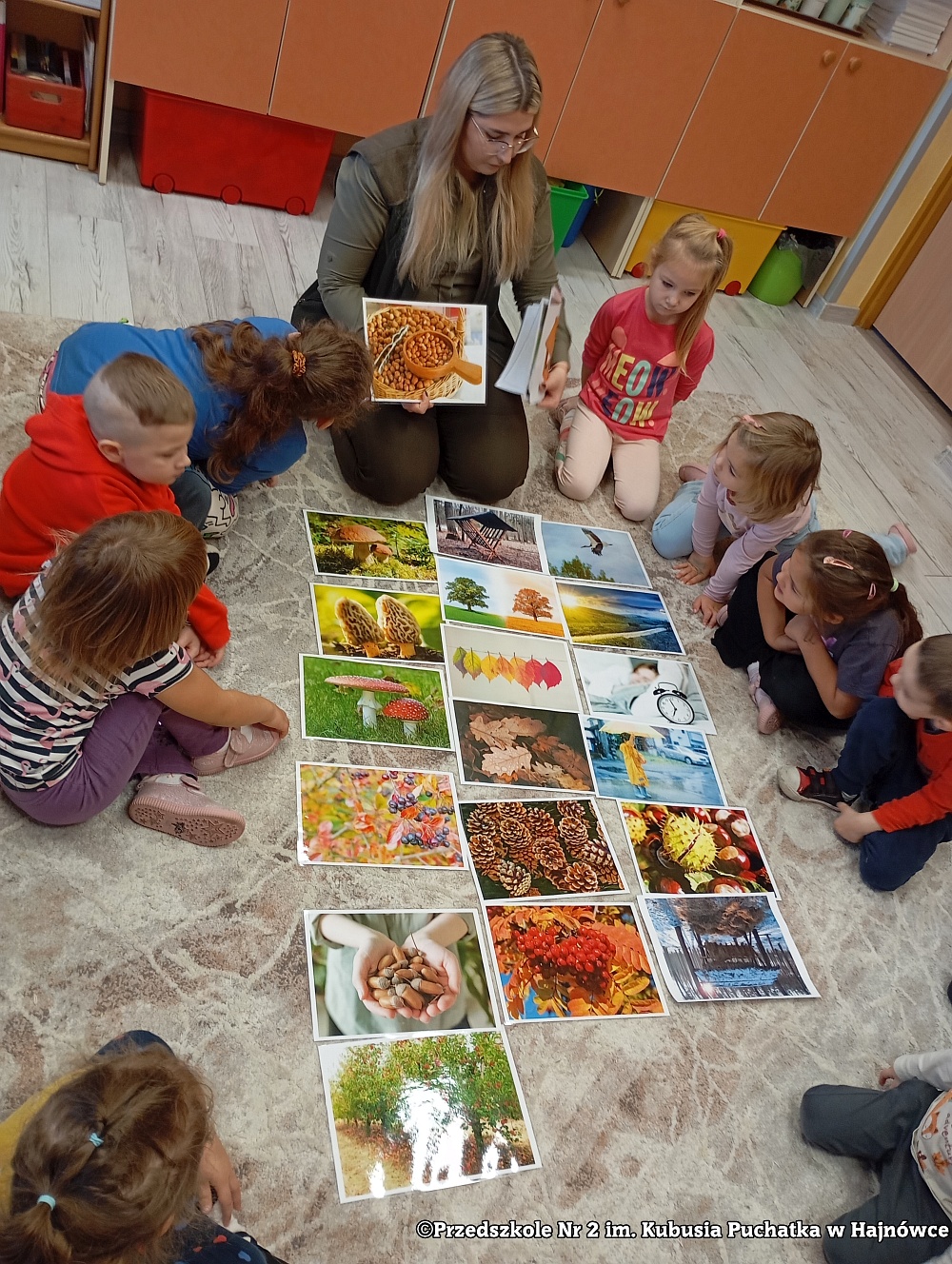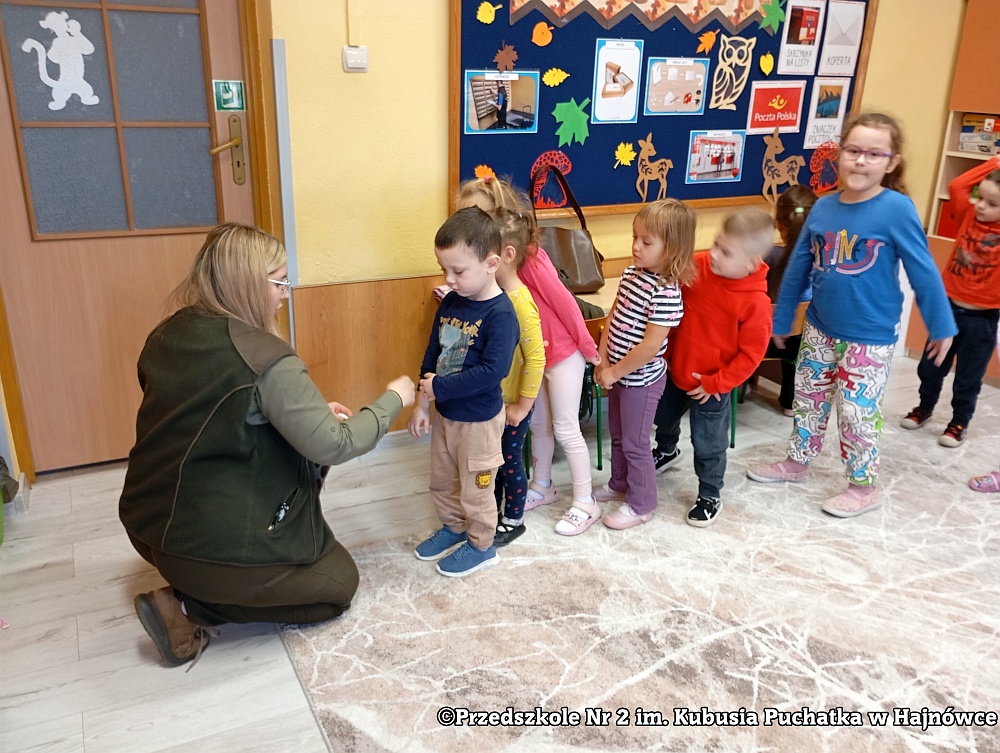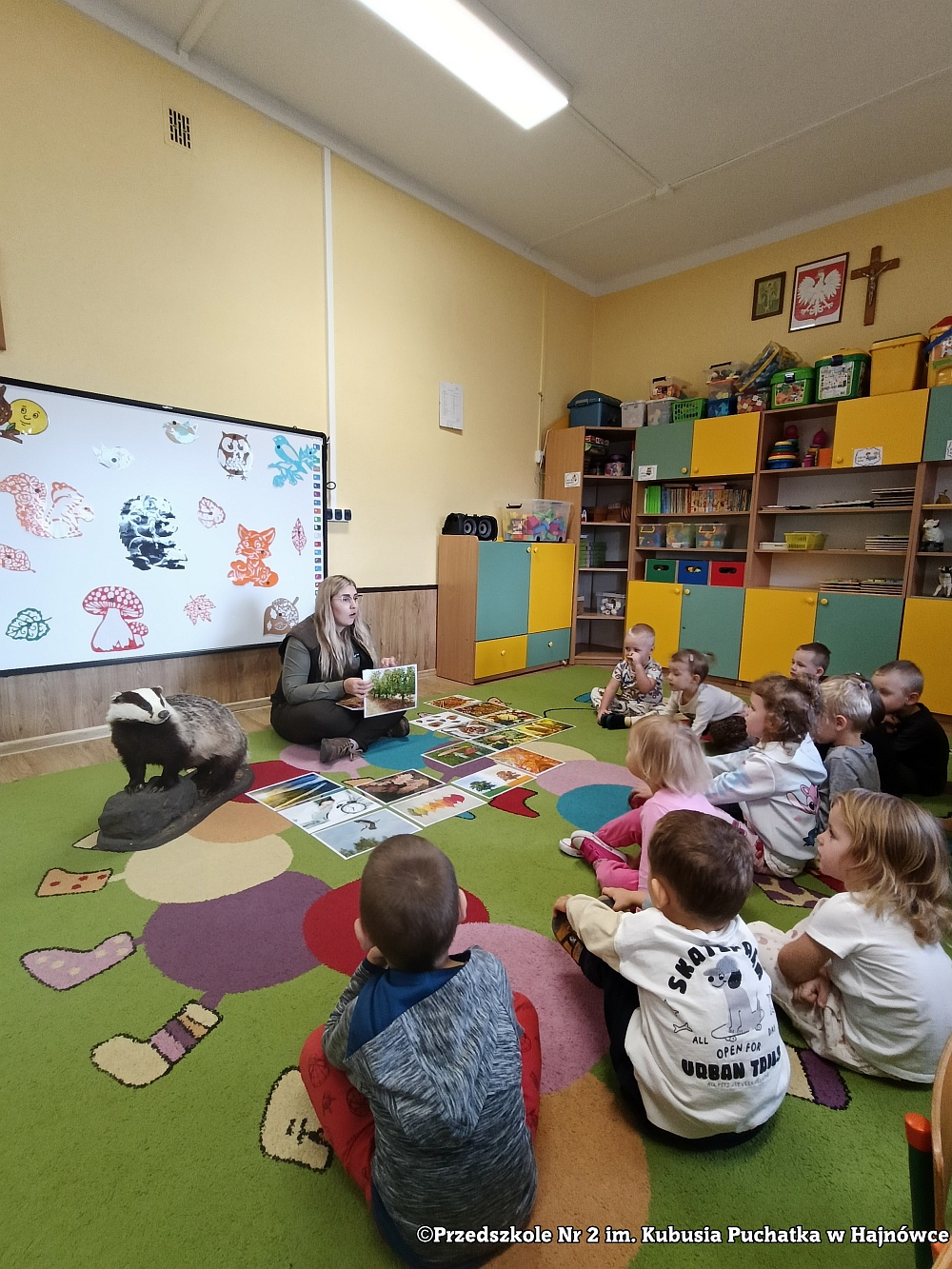 Grupa Puchatków uroczyście powitała nową porę roku – Panią Jesień, która będzie panować nam przez najbliższe miesiące. Podczas spotkania z Panią Mają, pracownikiem Nadleśnictwa Hajnówka wybraliśmy się na spacer do lasu w celu szukania pierwszych oznak jesieni. Pani Leśnik opowiedziała nam o zmianach zachodzących w przyrodzie, o jesiennych pracach zwierząt, wymienialiśmy a potem szukaliśmy darów jesiennego lasu tj. kasztany, żołędzie, jarzębina. Dziękujemy bardzo za wspólnie spędzony czas.