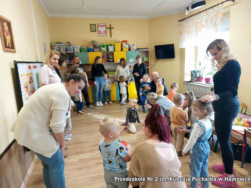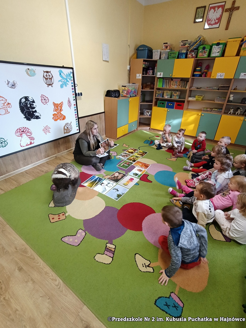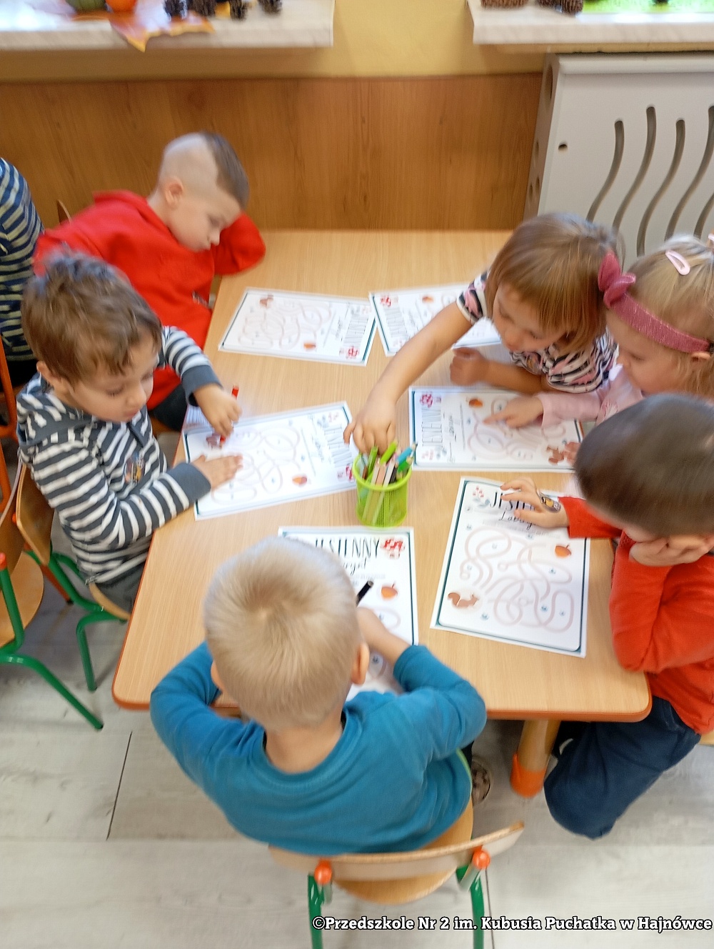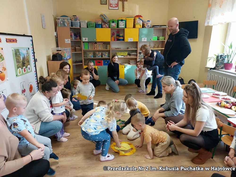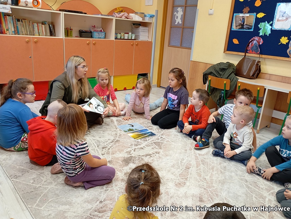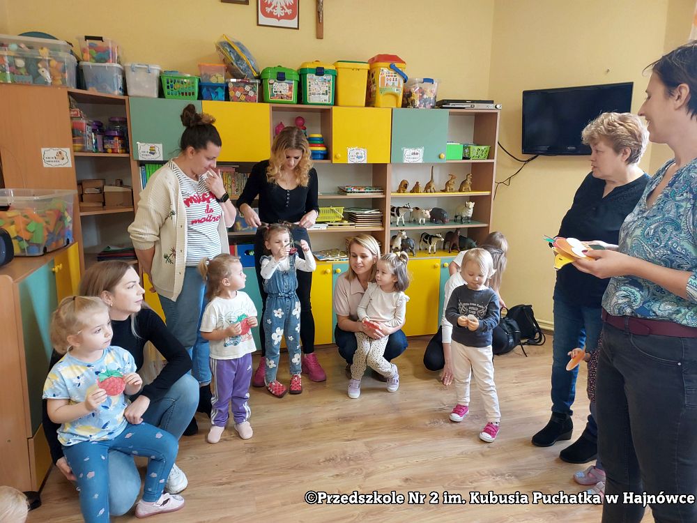 Grupa Puchatków uroczyście powitała nową porę roku – Panią Jesień, która będzie panować nam przez najbliższe miesiące. Podczas spotkania z Panią Mają, pracownikiem Nadleśnictwa Hajnówka wybraliśmy się na spacer do lasu w celu szukania pierwszych oznak jesieni. Pani Leśnik opowiedziała nam o zmianach zachodzących w przyrodzie, o jesiennych pracach zwierząt, wymienialiśmy a potem szukaliśmy darów jesiennego lasu tj. kasztany, żołędzie, jarzębina. Dziękujemy bardzo za wspólnie spędzony czas.