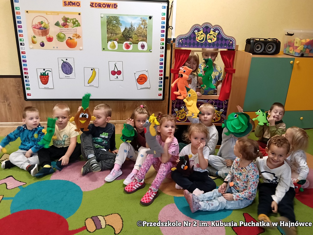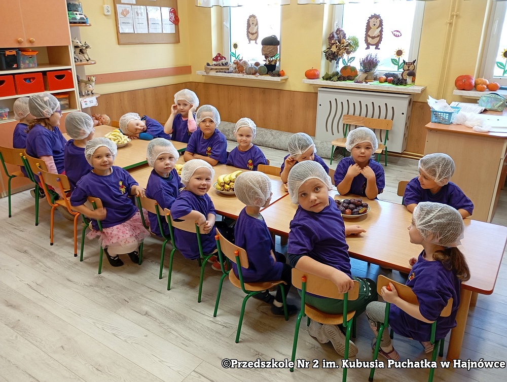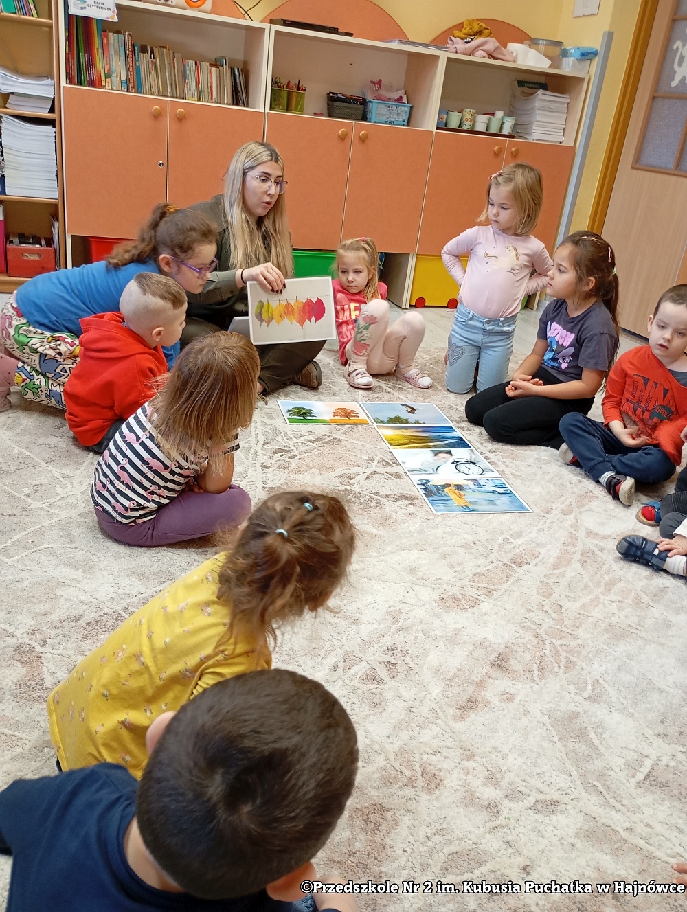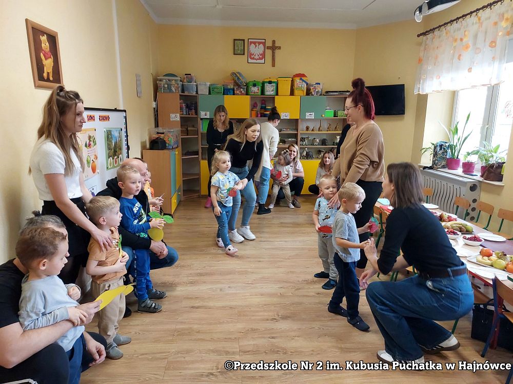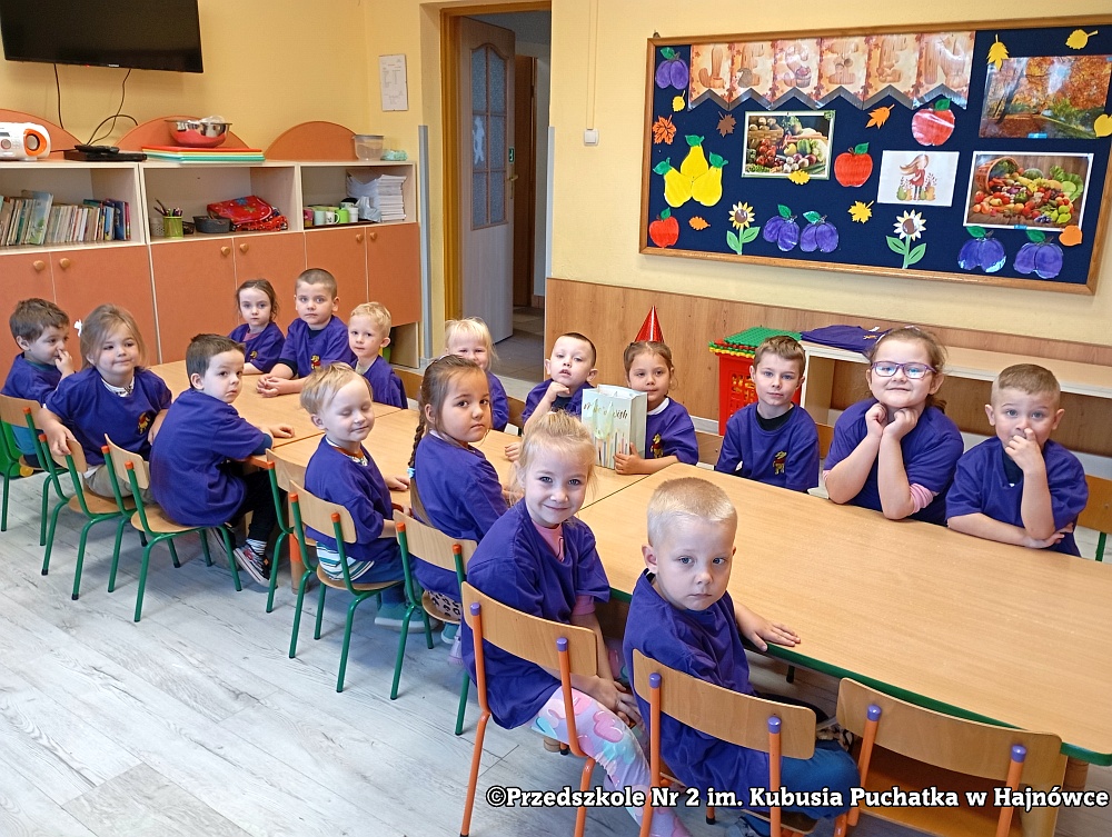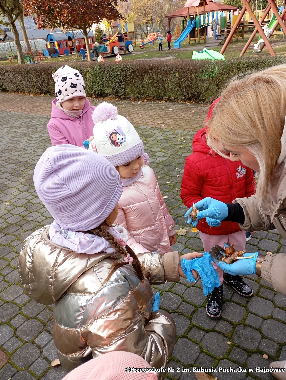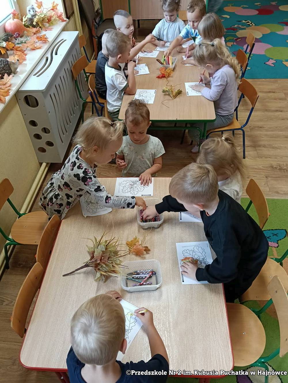 Grupa Puchatków uroczyście powitała nową porę roku – Panią Jesień, która będzie panować nam przez najbliższe miesiące. Podczas spotkania z Panią Mają, pracownikiem Nadleśnictwa Hajnówka wybraliśmy się na spacer do lasu w celu szukania pierwszych oznak jesieni. Pani Leśnik opowiedziała nam o zmianach zachodzących w przyrodzie, o jesiennych pracach zwierząt, wymienialiśmy a potem szukaliśmy darów jesiennego lasu tj. kasztany, żołędzie, jarzębina. Dziękujemy bardzo za wspólnie spędzony czas.
