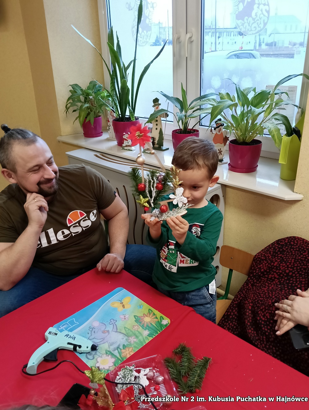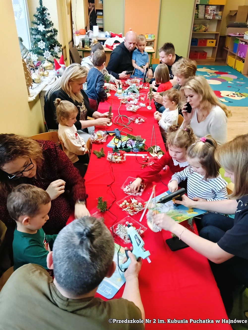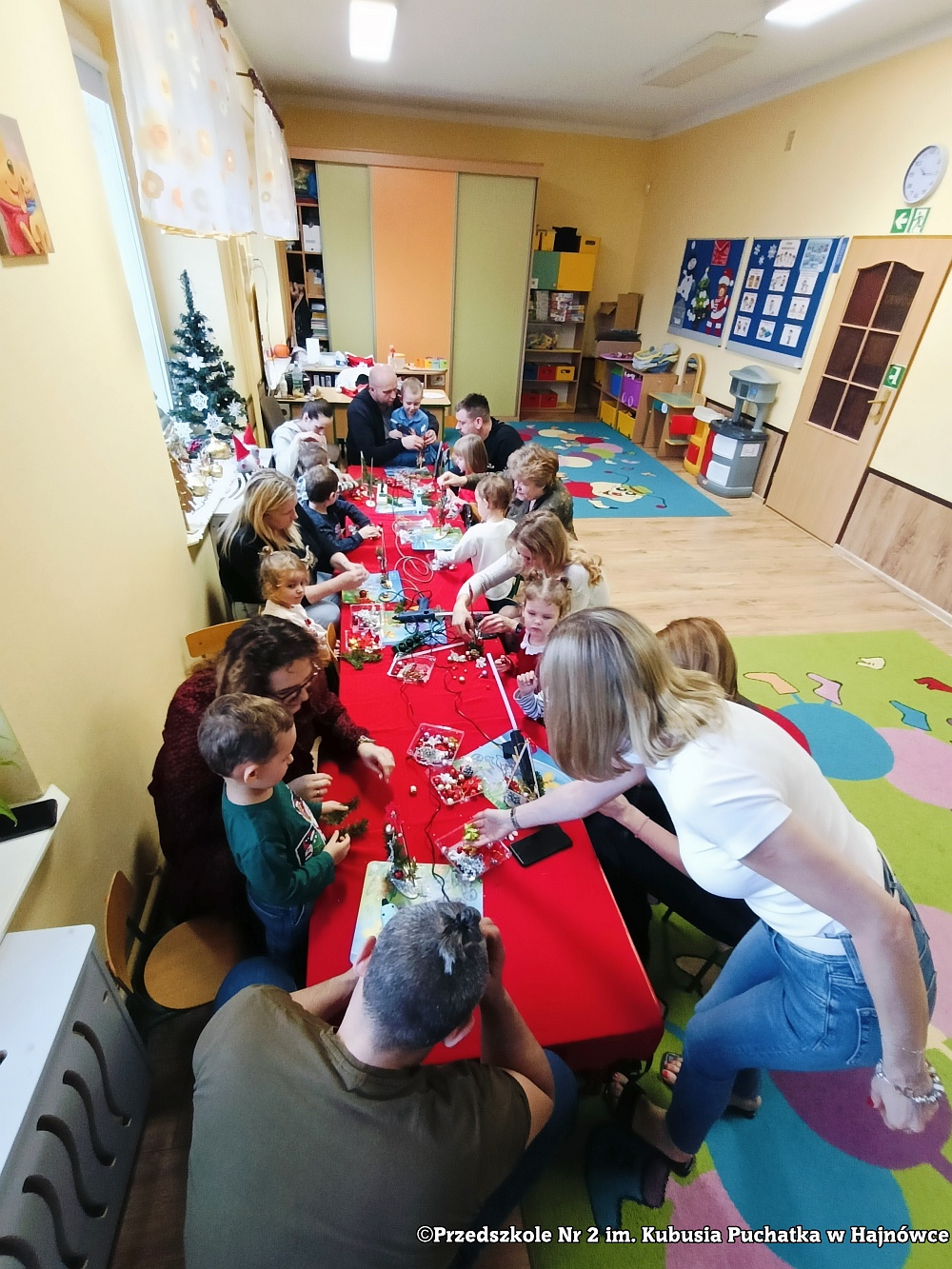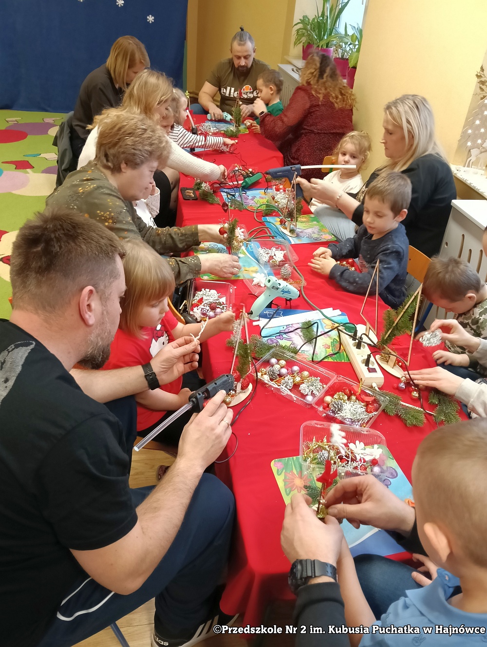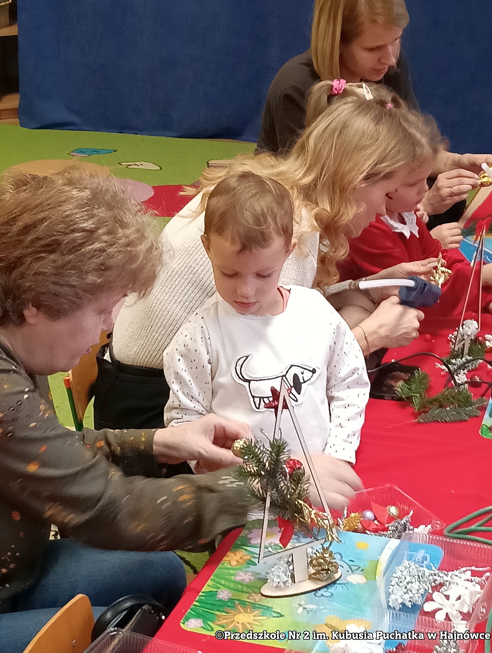 Podczas warsztatów dzieci zaprezentowały zimowo – świąteczną część artystyczną do utworów muzycznych m.in. „Płatek śniegu”, „Przyszła zima biała” oraz „Mikołaju!” w trakcie której rodzice mieli możliwość obserwacji swojej pociechy na tle grupy oraz poczuć świąteczny klimat. Następnie wszyscy uczestnicy ozdobili z różnorodnych materiałów – gałązek świerkowych i sosnowych oraz ozdób świątecznych: bombek, gwiazdek, złotych i srebrnych gałązek, szyszek otrzymane drewniane szablony choinek Każda choinka była wyjątkowa i odzwierciedlała indywidualne pomysły oraz wyobraźnię uczestników. Nie zabrakło brokatu, kolorowych bombek, wstążek i światełek, które nadały choinkom wyjątkowego, świątecznego charakteru.