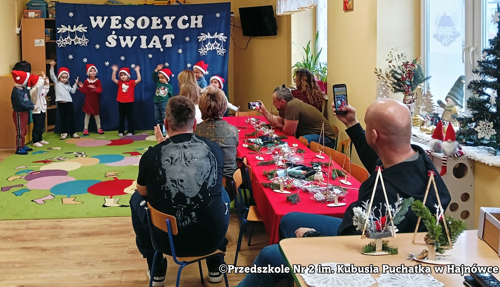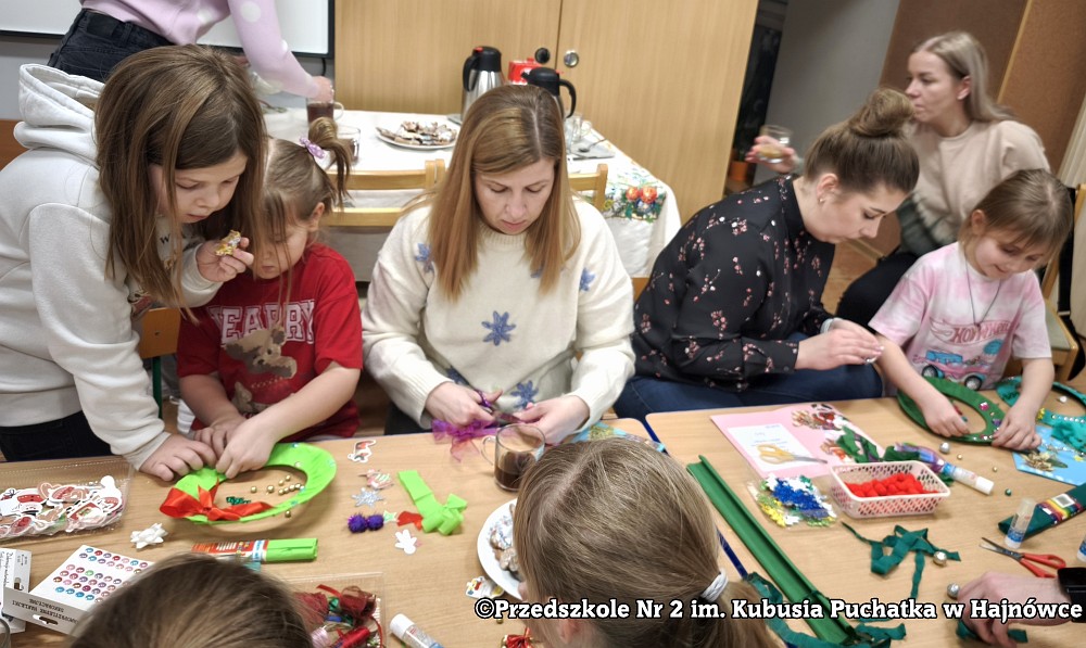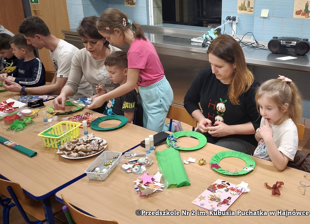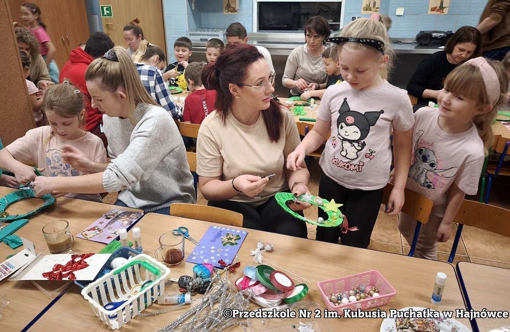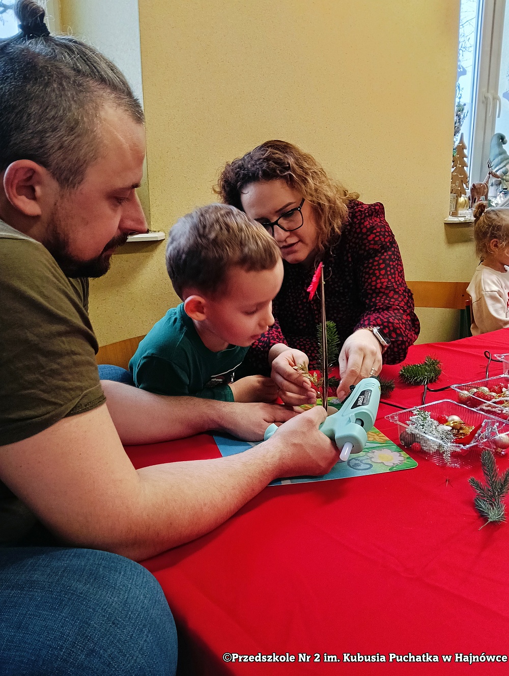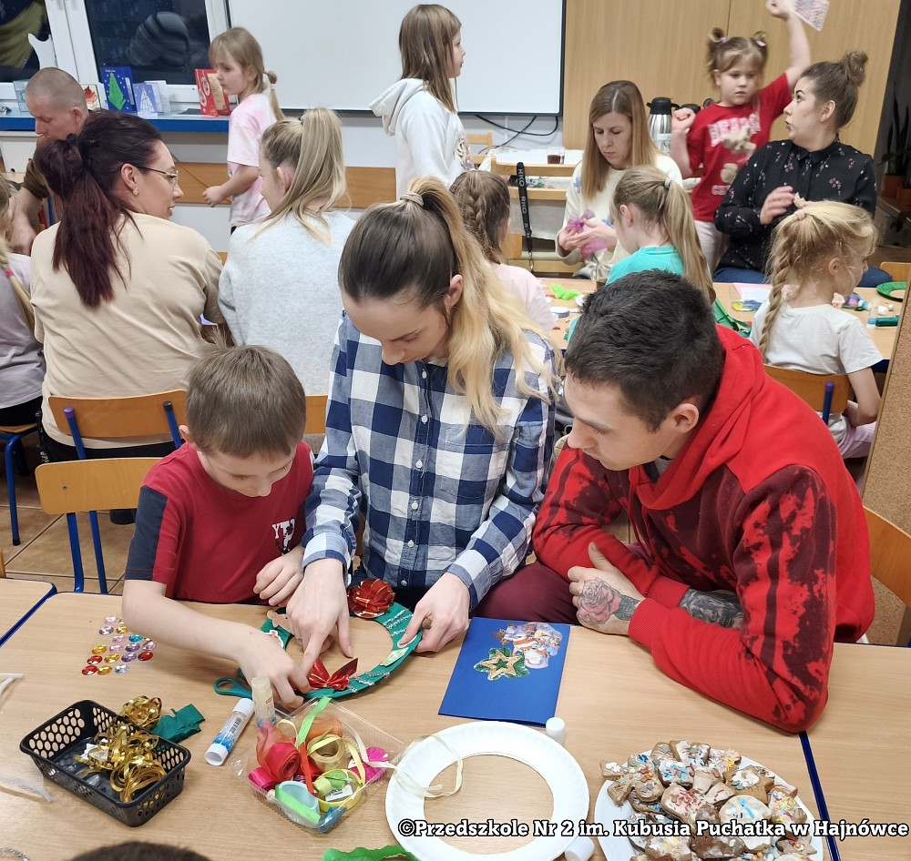 Podczas warsztatów dzieci zaprezentowały zimowo – świąteczną część artystyczną do utworów muzycznych m.in. „Płatek śniegu”, „Przyszła zima biała” oraz „Mikołaju!” w trakcie której rodzice mieli możliwość obserwacji swojej pociechy na tle grupy oraz poczuć świąteczny klimat. Następnie wszyscy uczestnicy ozdobili z różnorodnych materiałów – gałązek świerkowych i sosnowych oraz ozdób świątecznych: bombek, gwiazdek, złotych i srebrnych gałązek, szyszek otrzymane drewniane szablony choinek Każda choinka była wyjątkowa i odzwierciedlała indywidualne pomysły oraz wyobraźnię uczestników. Nie zabrakło brokatu, kolorowych bombek, wstążek i światełek, które nadały choinkom wyjątkowego, świątecznego charakteru.