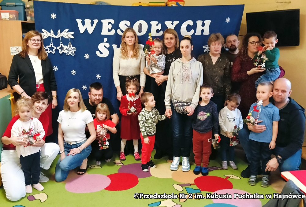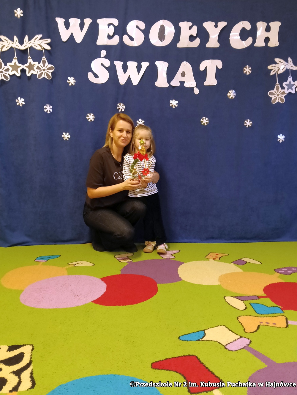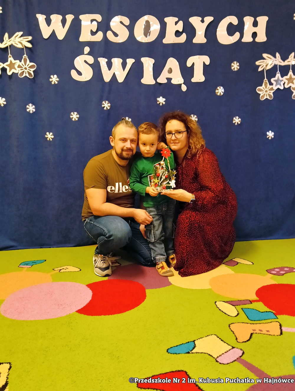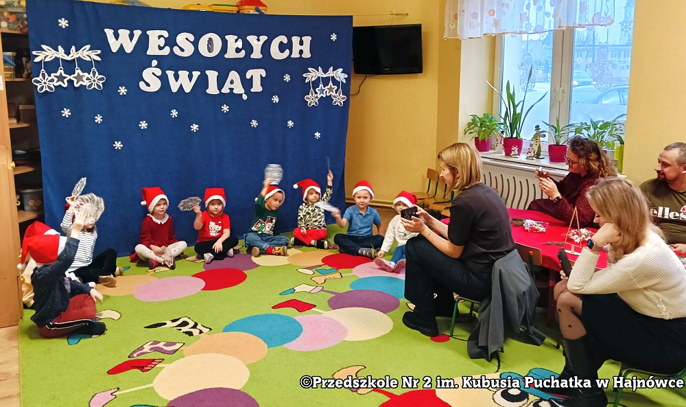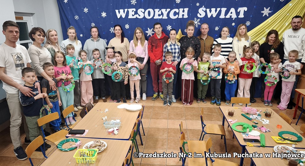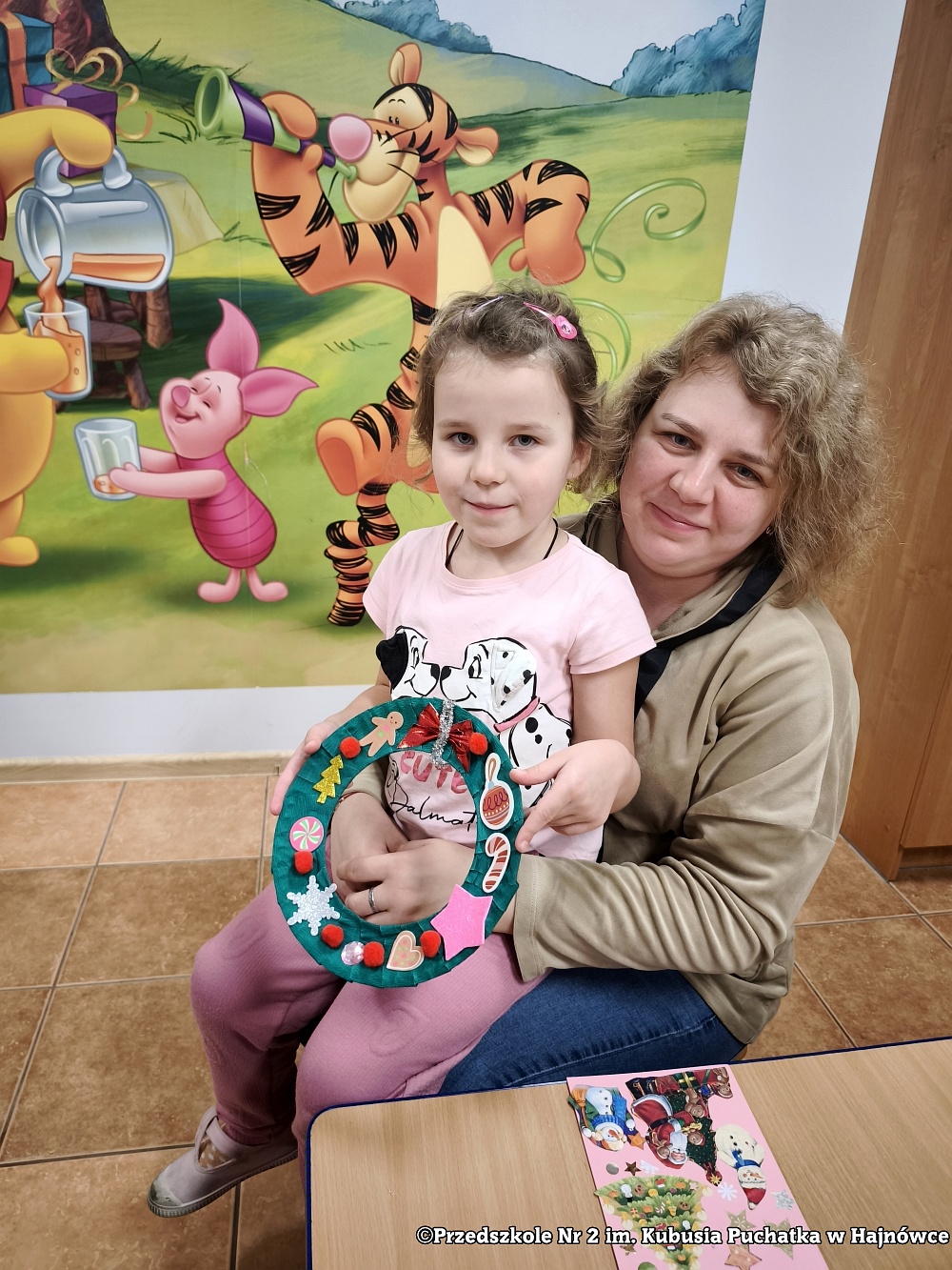 Podczas warsztatów dzieci zaprezentowały zimowo – świąteczną część artystyczną do utworów muzycznych m.in. „Płatek śniegu”, „Przyszła zima biała” oraz „Mikołaju!” w trakcie której rodzice mieli możliwość obserwacji swojej pociechy na tle grupy oraz poczuć świąteczny klimat. Następnie wszyscy uczestnicy ozdobili z różnorodnych materiałów – gałązek świerkowych i sosnowych oraz ozdób świątecznych: bombek, gwiazdek, złotych i srebrnych gałązek, szyszek otrzymane drewniane szablony choinek Każda choinka była wyjątkowa i odzwierciedlała indywidualne pomysły oraz wyobraźnię uczestników. Nie zabrakło brokatu, kolorowych bombek, wstążek i światełek, które nadały choinkom wyjątkowego, świątecznego charakteru.