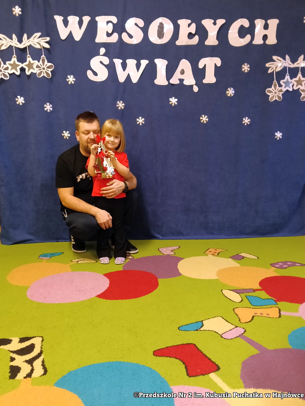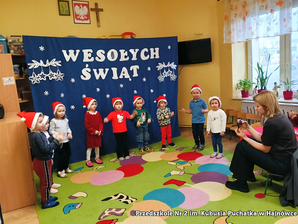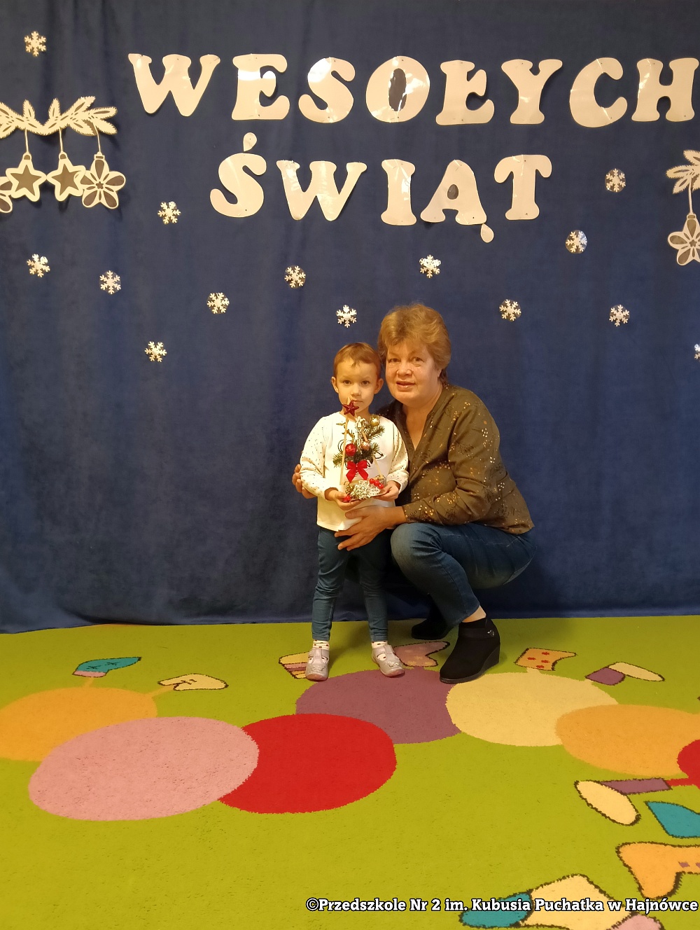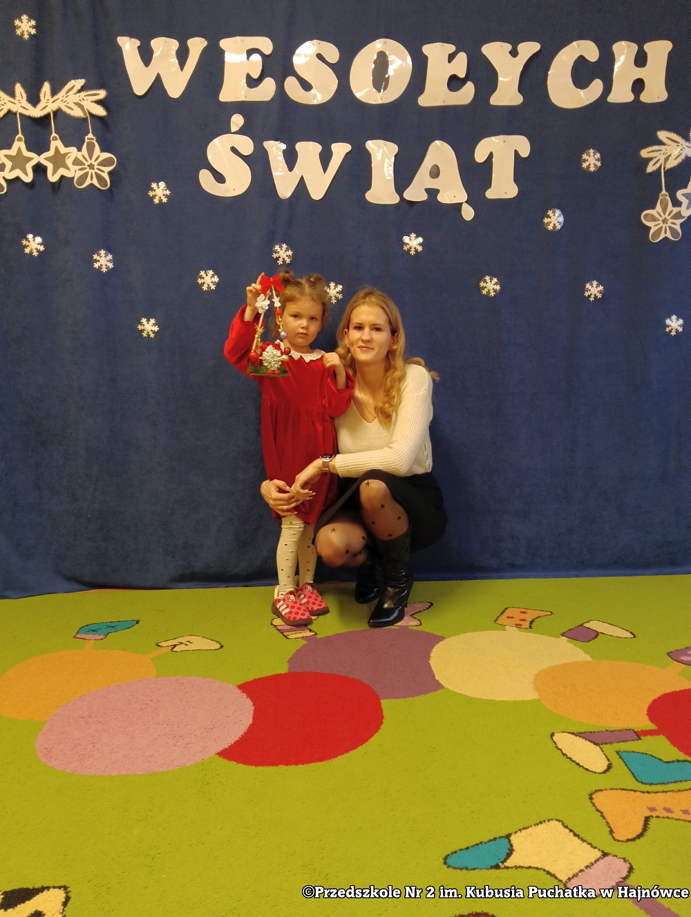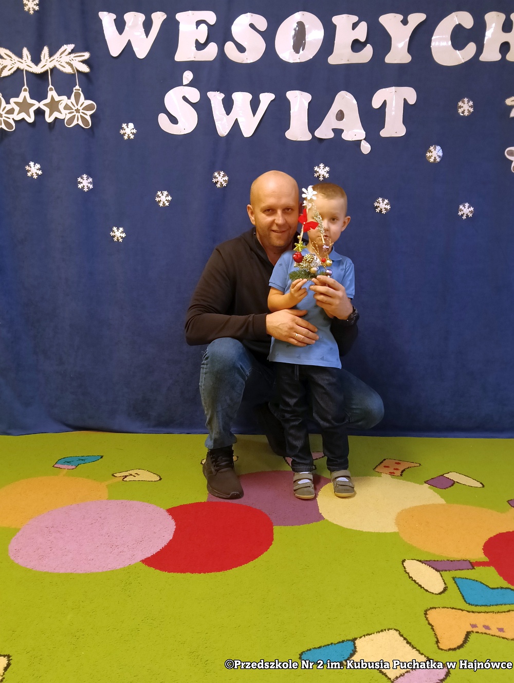 Podczas warsztatów dzieci zaprezentowały zimowo – świąteczną część artystyczną do utworów muzycznych m.in. „Płatek śniegu”, „Przyszła zima biała” oraz „Mikołaju!” w trakcie której rodzice mieli możliwość obserwacji swojej pociechy na tle grupy oraz poczuć świąteczny klimat. Następnie wszyscy uczestnicy ozdobili z różnorodnych materiałów – gałązek świerkowych i sosnowych oraz ozdób świątecznych: bombek, gwiazdek, złotych i srebrnych gałązek, szyszek otrzymane drewniane szablony choinek Każda choinka była wyjątkowa i odzwierciedlała indywidualne pomysły oraz wyobraźnię uczestników. Nie zabrakło brokatu, kolorowych bombek, wstążek i światełek, które nadały choinkom wyjątkowego, świątecznego charakteru.