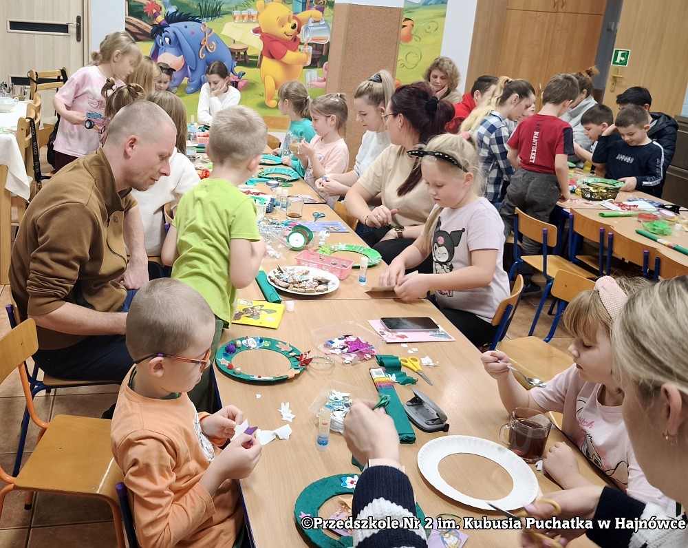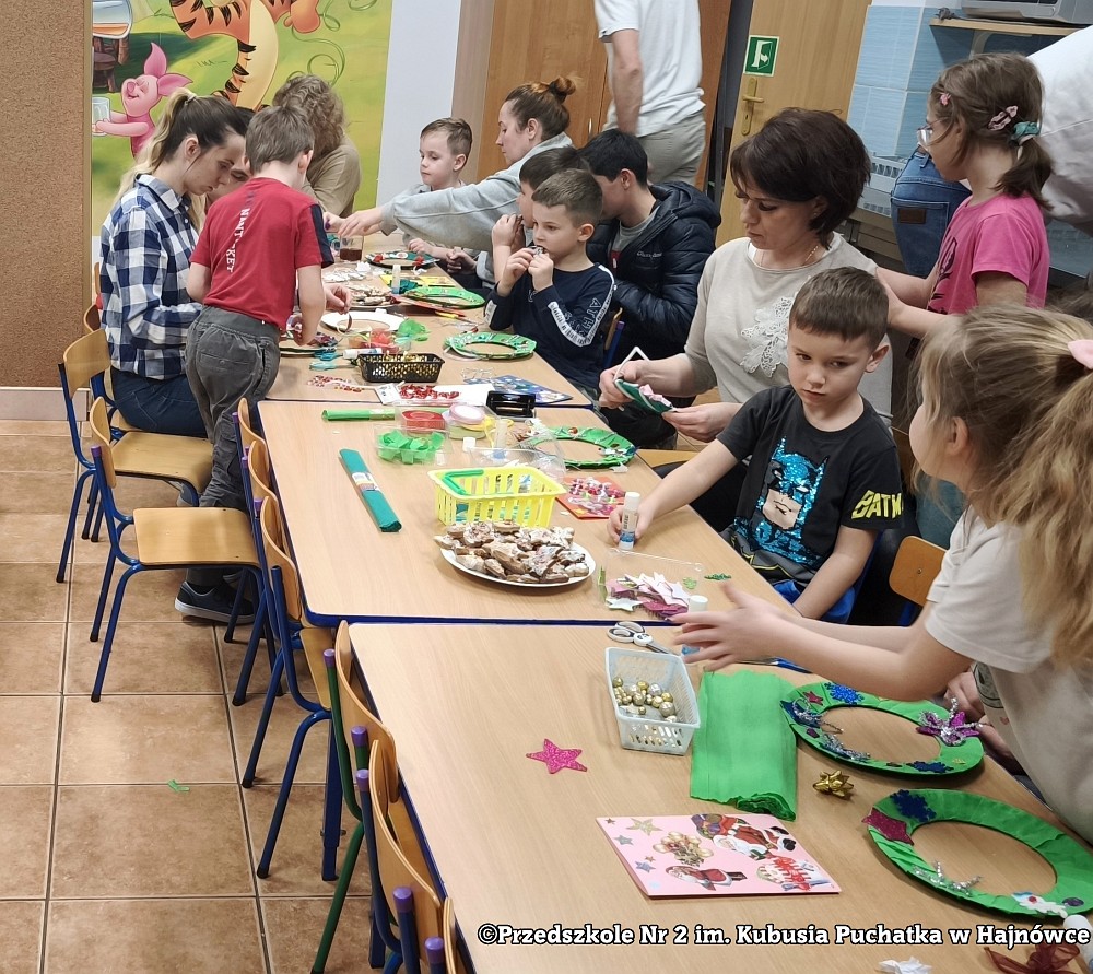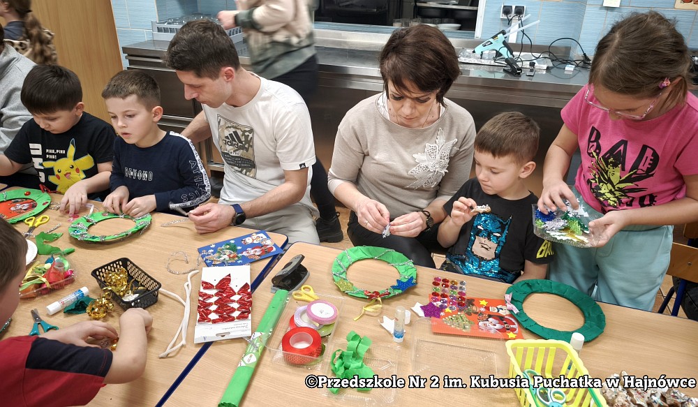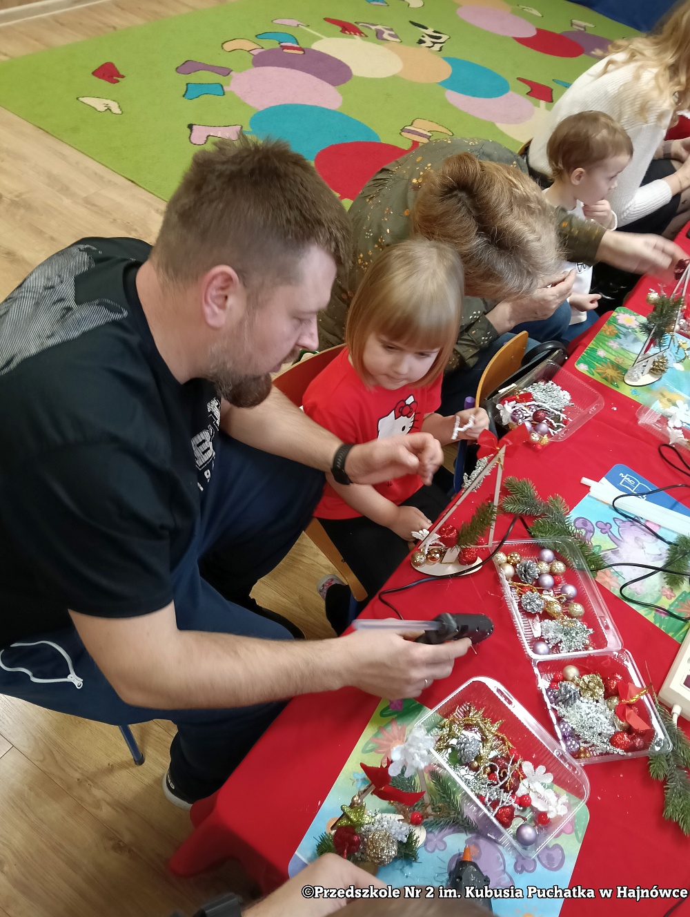 Święta Bożego Narodzenia to szczególny czas. Zapach pomarańczy, piernika i przystrojona choinka – to buduje magiczny świąteczny klimat. I właśnie po to, aby i w naszym przedszkolu zagościła świąteczna atmosfera w grudniu zorganizowałyśmy warsztaty Bożonarodzeniowe z udziałem rodziców. Celem było wykonanie ozdób świątecznych. Rodzice i dzieci z zapałem wykonywali piękne ozdoby, wykazując przy tym wiele pomysłowości i kreatywności. Wspólna twórczość w atmosferze zabawy, zaangażowanie, przeżyte emocje, a co najważniejsze czas, który dzieci spędziły z rodzicami to bardzo cenne doświadczenie dla obu stron.