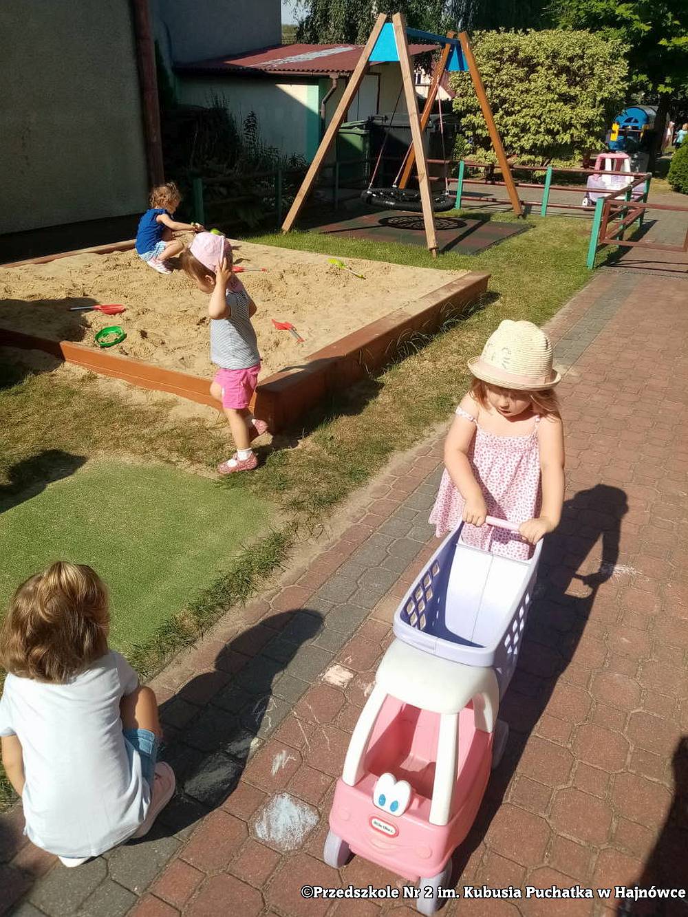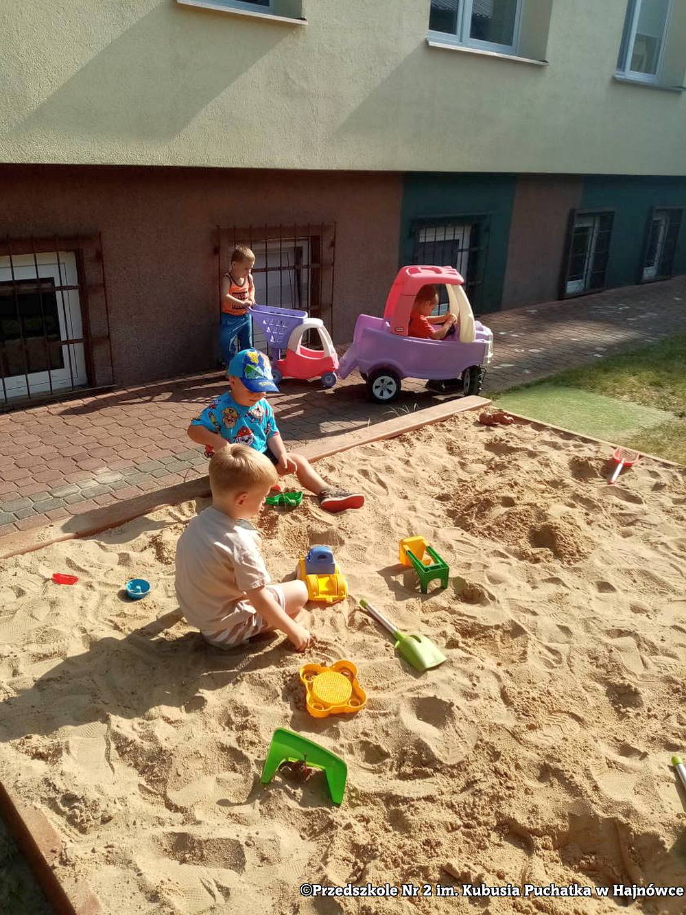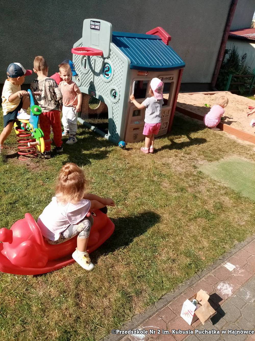 Na zdjęciu widoczne są dzieci z grupy II i IV podczas zabaw na palcu przedszkolnym .