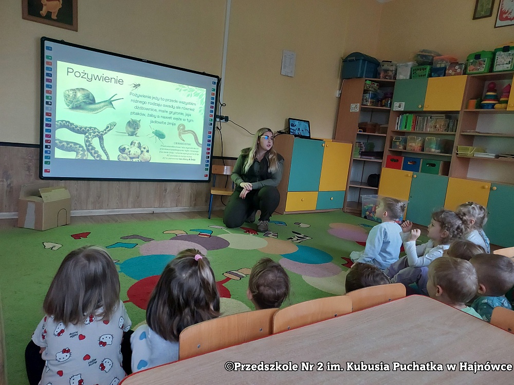 Pani Magdalena w ciekawy i dostosowany do wieku dzieci sposób opowiedziała o tym, jak bezpiecznie bawić się na świeżym powietrzu, unikać niebezpiecznych miejsc oraz jak chronić się przed kleszczami. Przedszkolaki dowiedziały się, gdzie najczęściej można spotkać te groźne pajęczaki, jak się przed nimi zabezpieczać i co zrobić, jeśli kleszcz jednak się pojawi.