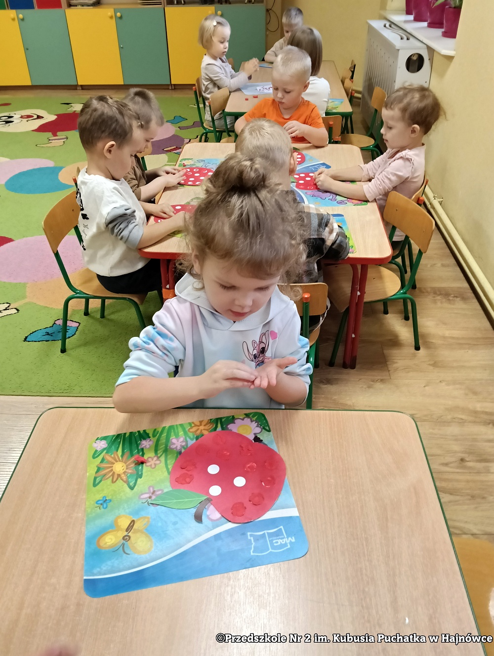 Dnia 12 września Tygryski obchodziły Dzień kropki w Miejskiej Biblioteki Publicznej w Hajnówce. Celem tego święta jest rozwijanie kreatywności dzieci, pomysłowości i pobudzenie ich do tworzenia i działania. Przedszkolaki poznały genezę tego święta i wysłuchały opowiadania jak to zwyczajna kropka zmieniła świat małej dziewczynki o imieniu Vashti. Historia ta uświadomiła przedszkolakom, że każdy z nas ma jakieś ukryte zdolności, TALENT. Wspólnie w grupie stworzyliśmy plakat „Nasze talenty”. Dostrzegaliśmy również, że świat składa się z kropek małych i dużych. Kropki gościły w zabawach ruchowych jak i matematycznych. Wspólnie liczyliśmy, segregowaliśmy kolorowe kropki i bawiliśmy się z kropkami przy muzyce. Było "KROPKOWO" i radośnie.