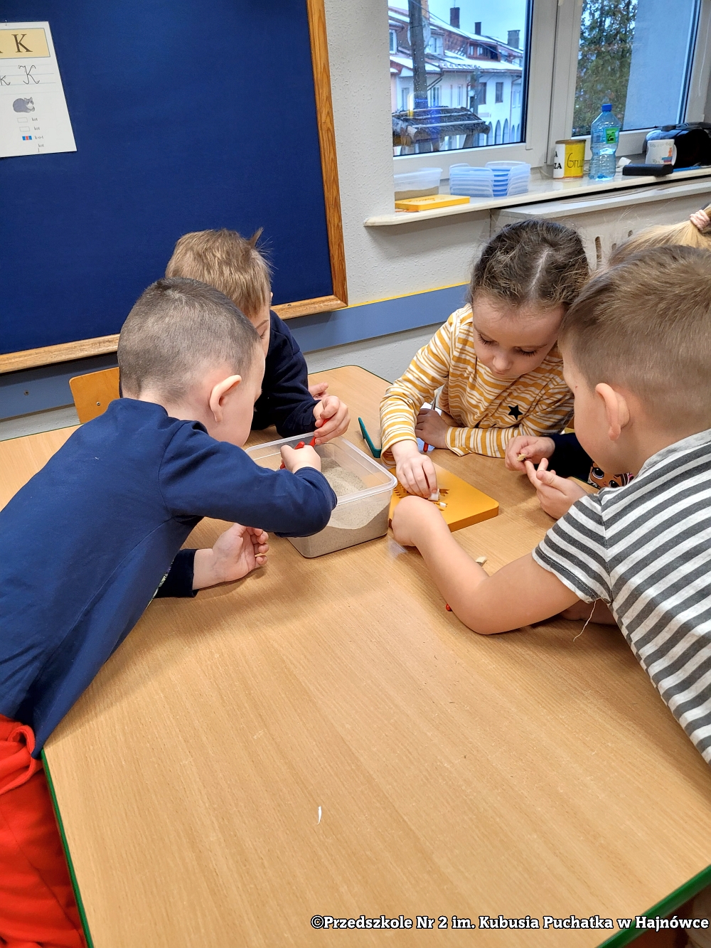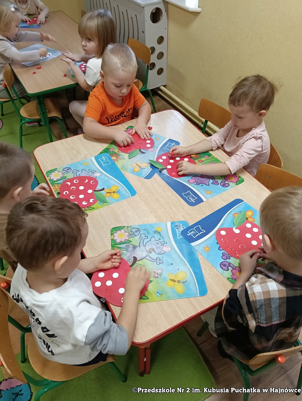 Na zdjęciach widoczne są dzieci z grupy I "Sówki" podczas zajęć dydaktycznych