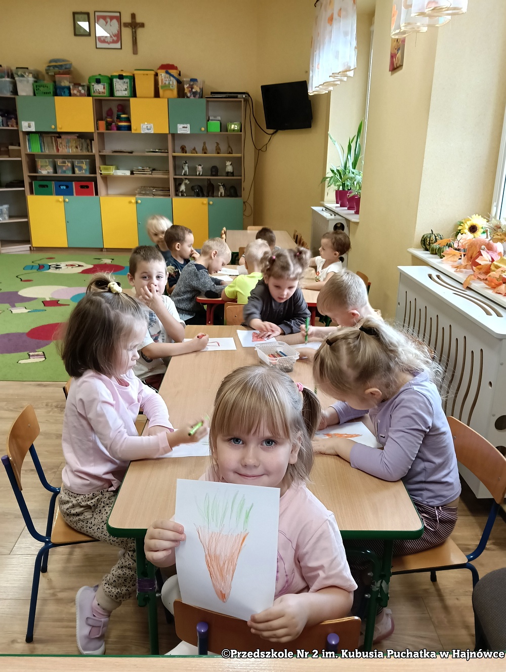 W piątek 26 września 2025r., dzieci z grupy „Króliczki” (5–6 lat) wyruszyły na pełną radości i smaków wycieczkę do Dubin, gdzie w Gminnym Centrum Kultury obchodziły tradycyjne Święto Pieczonego Ziemniaka. Głównym bohaterem dnia był oczywiście ziemniak – nie tylko jako smaczna przekąska, ale też jako inspiracja do zabaw i zajęć edukacyjnych. Przedszkolaki dowiedziały się, skąd pochodzi ziemniak, jak wygląda jego uprawa i jakie potrawy można z niego przygotować. „Króliczki” z entuzjazmem uczestniczyły w ziemniaczanych konkurencjach: rzucie ziemniakiem do celu, sztafecie z bulwą oraz w quizie wiedzy o warzywach. Wycieczka do Dubin była nie tylko okazją do poznania ziemniaka „od podszewki”, ale też do wspólnego spędzenia czasu poza murami przedszkola. Dzieci wróciły pełne wrażeń, z uśmiechami na twarzach i ziemniaczanymi pamiątkami w plecakach. Święto Pieczonego Ziemniaka na długo pozostanie w ich pamięci jako dzień pełen zabawy, smaku i jesiennej magii.