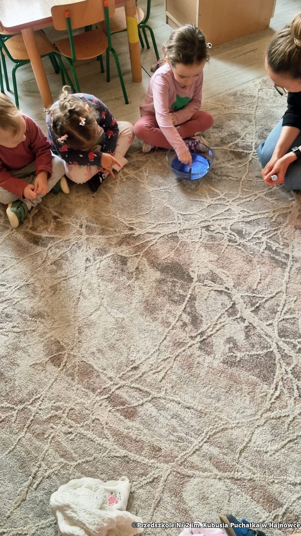 Następnie przyszedł czas na zabawy z chustą animacyjną. Kolorowa chusta unosiła się i opadała, tworząc magiczne fale, tunele i parasole. Zabawy ruchowe i integracyjne były doskonałą okazją do współpracy i rozwijania koordynacji ruchowej. Na koniec zabaw, w rmach odpoczynku, dzieci robiły spokojne wachlowanie swoim kolegom i koleżankom.