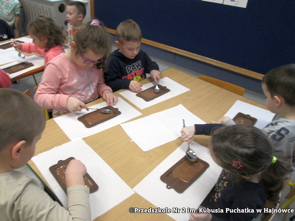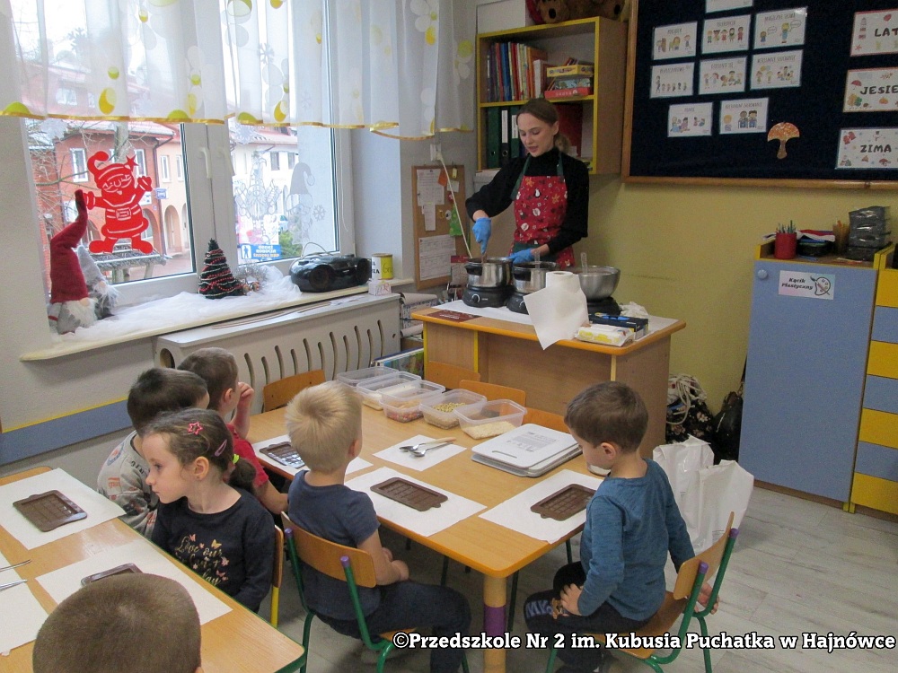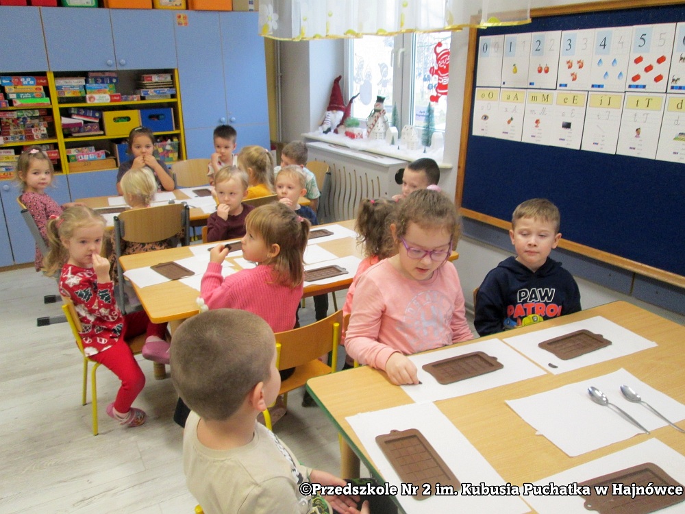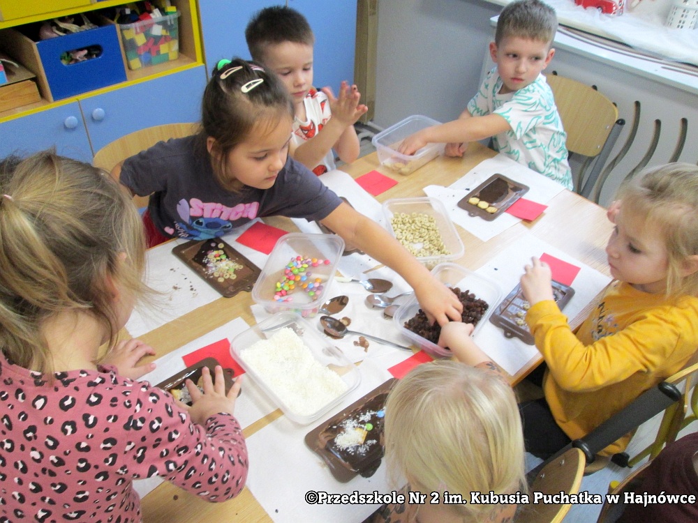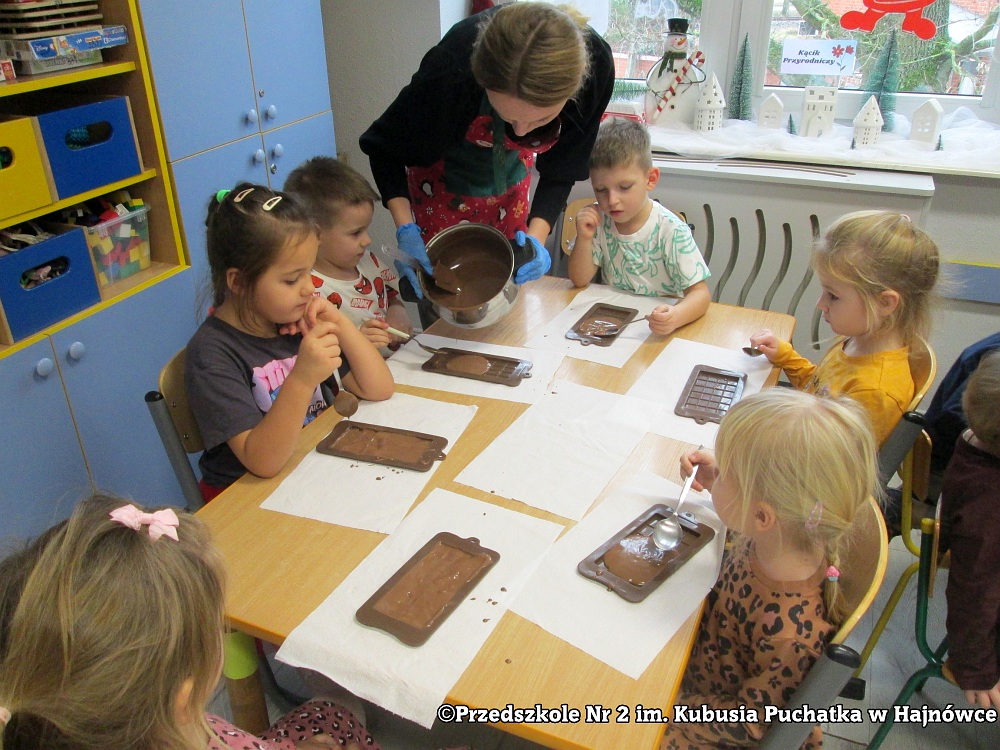 3 grudnia Tygryski i Puchatki wzięły udział w niezwykłych, słodkich i przyjemnych warsztatach, w których główną rolę pełniła czekolada. Po miłym powitaniu przedszkolaki zapoznały się z etapami wykonywania czekolady. Podczas warsztatów dzieci miały okazję poznać etapy produkcji czekolady – począwszy od jej głównego składnika – kakaowca, po ostateczny produkt jakim jest tabliczka czekolady. Następnie uczestnicy degustowali różne rodzaje czekolady. Po takim “małym poczęstunku” można już było zabrać się do twórczej pracy. Dzieci otrzymały formy, które wypełnione były płynną czekoladą, miały okazję ozdabiać czekoladę (suszonymi owocami, wiórkami kokosowymi, itp.) a przy okazji podjadać co nieco. Każdy przedszkolak stworzył własnoręcznie swoją wymarzoną tabliczkę- serduszko czekolady, którą pakował w folię, wiązał wstążeczkę a po skończonych warsztatach zabierał do domu i dzielił się z najbliższymi. Na koniec warsztatów otrzymały Dyplom Mistrza Czekolady. Można stwierdzić z pełnym przekonaniem, że dzieci czerpały nieograniczoną radość podczas zabawy z czekoladą. To wspaniałe warsztaty i świetny pomysł na zabawę, edukację i integrację.