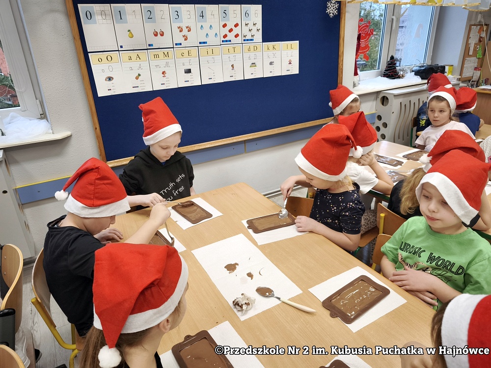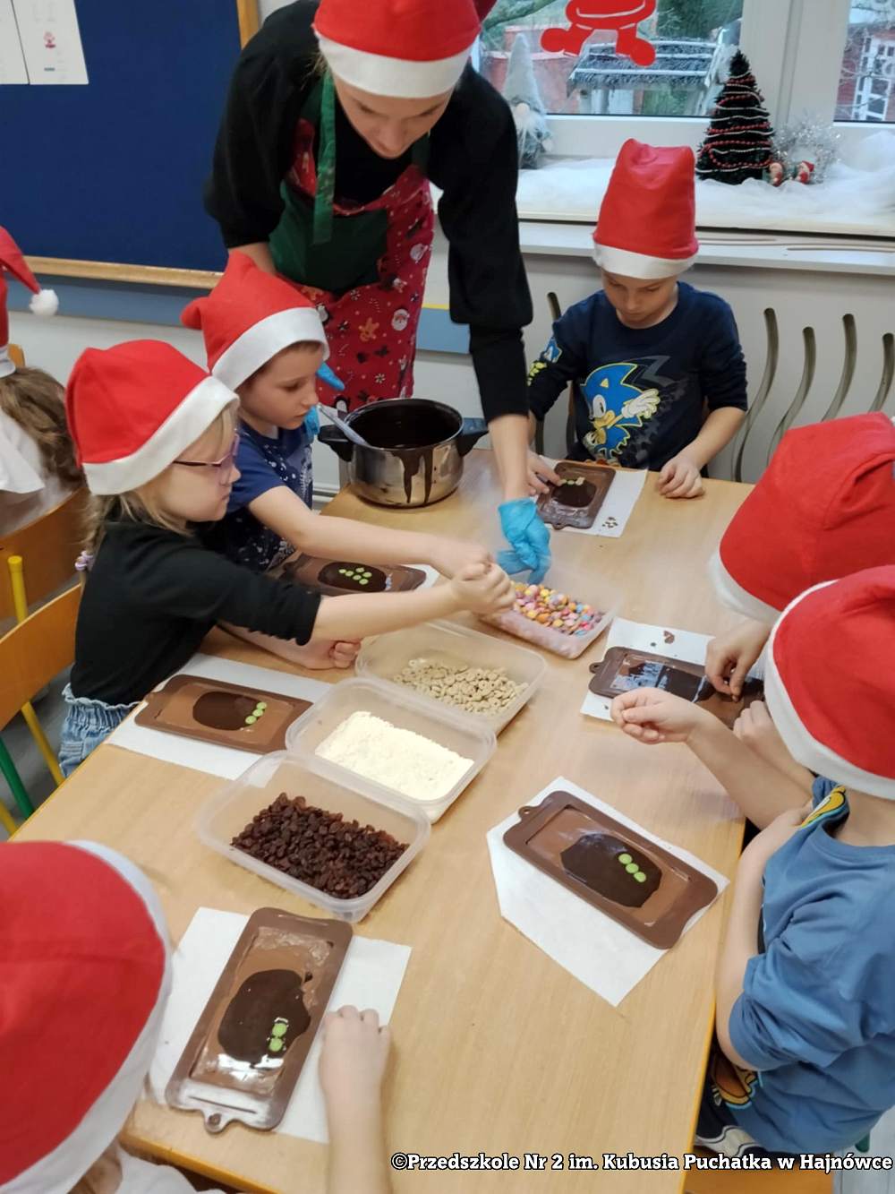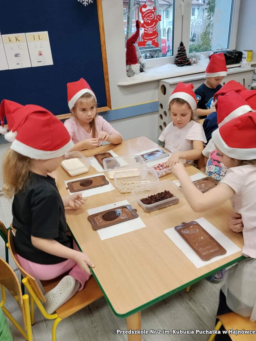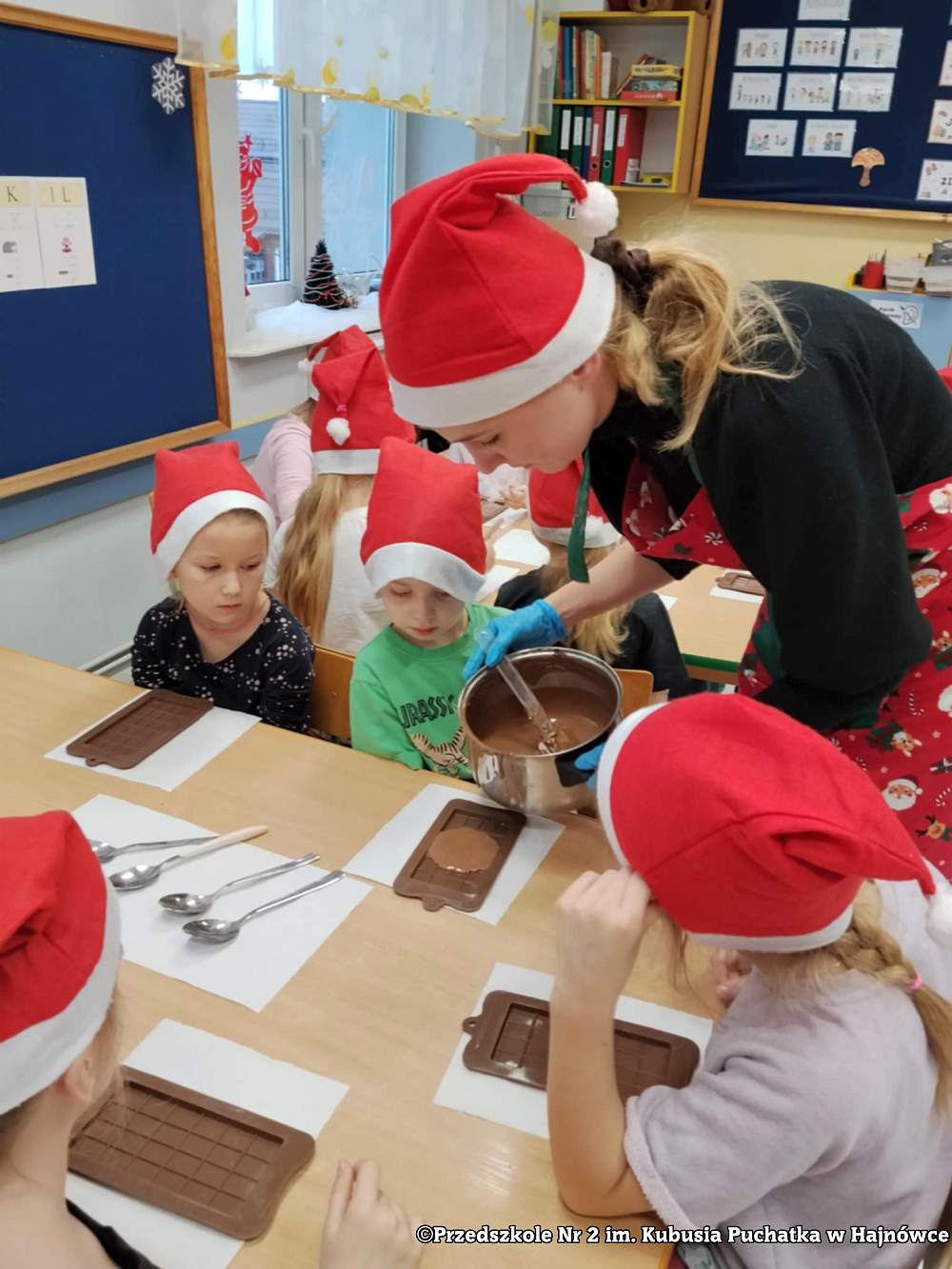 Na zdjęciach widoczne są zdjęcia z dziećmi z grupy IV Puchatki podczas spotkania z Mikołajem i na warsztatach z robienia czekolady.