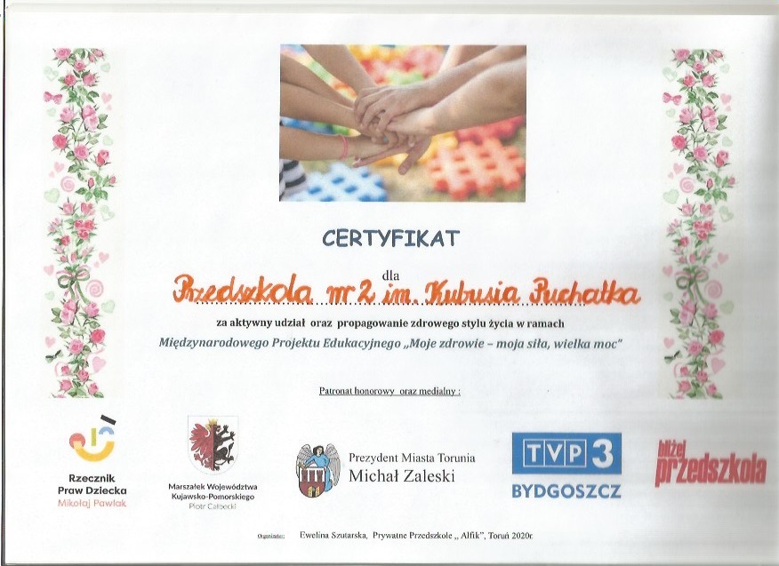 Nasze Przedszkole nr 2 im. Kubusia Puchatka w Hajnówce w roku szkolnym 2019/2020 uzyskało Certyfikat w Międzynarodowym Projekcie z zakresu edukacji prozdrowotnej i profilaktyki uzależnień ,,Moje zdrowie – moja siła, wielka moc”, w którym udział wzięły wszystkie grupy przedszkolne: Kangurki, Króliczki, Puchatki, Sówki, Tygryski wraz z paniami nauczycielkami poszczególnych grup. Celem głównym projektu było: wychowanie zdrowego, aktywnego, świadomego swoich możliwości i posiadającego umiejętność współistnienia z przyrodą przedszkolaka. W ramach realizacji V modułów m.in.: