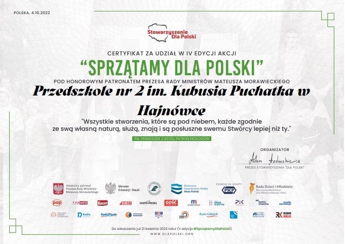 Nasze przedszkole w roku szkolnym 2023/2024 zdobyło certyfikat za udział dzieci z grupy: I, II, III, IV i V wraz z paniami w finale jesiennej VI edycji akcji #SprzątamyDlaPolski pod Honorowym Patronatem Prezesa Rady Ministrów Mateusza Morawieckiego, której celem była walka z zanieczyszczeniami w lasach, parkach, skwerach i innych terenach zielonych oraz promowanie od najmłodszych lat zasad dbania o środowisko. Dzieci z chęcią i radością włączyły się do akcji, by posprzątać nasze środowisko. Tegoroczna akcja #SprzątamyDlaPolski była świetną okazją, aby uświadomić dzieciom, jak wiele dobrego człowiek może zrobić dla środowiska poprzez właściwe zachowanie. Dbajmy o naszą planetę każdego dnia, aby cieszyć się otaczającym nas pięknem przyrody.